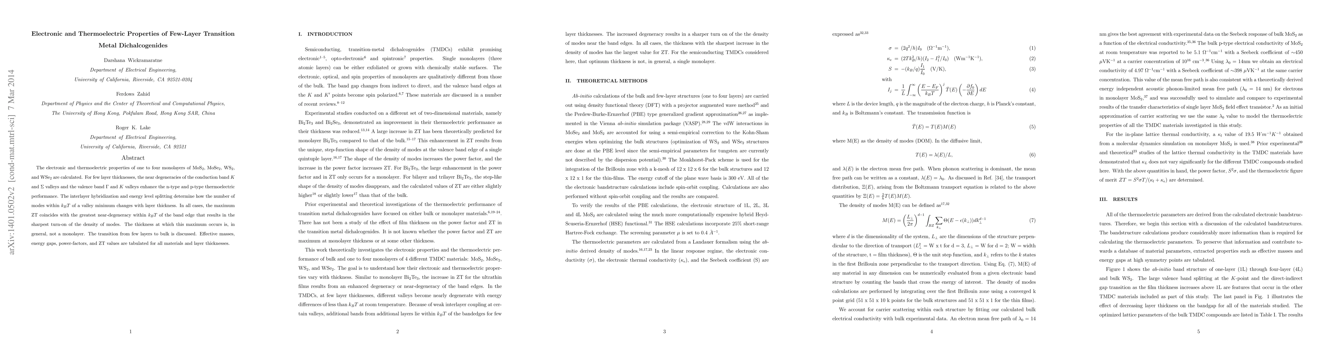 This paper investigates the electronic and thermoelectric properties of few-layer transition metal dichalcogenides, finding that near-degeneracies in band valleys enhance thermoelectric performance. The study shows that maximum thermoelectric efficiency (ZT) occurs at layer thicknesses where the density of modes sharply increases, typically not at monolayers, and discusses the transition from few layers to bulk materials.