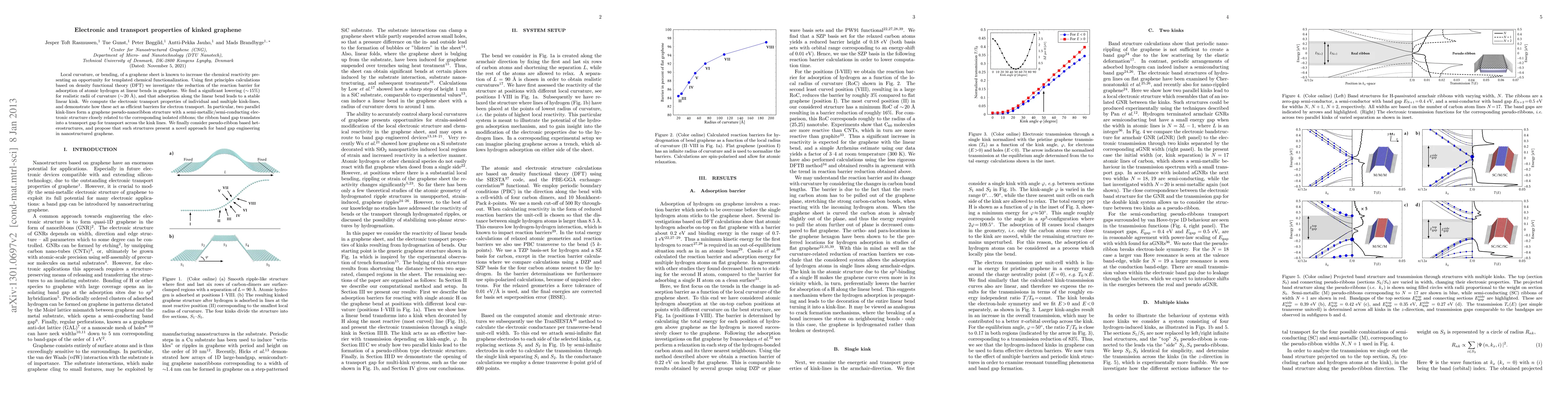 This paper investigates the electronic and transport properties of kinked graphene using density functional theory. It finds that linear bends in graphene lower the reaction barrier for hydrogen adsorption and act as barriers for electron transport, suggesting potential for band gap engineering in graphene nanostructures.
