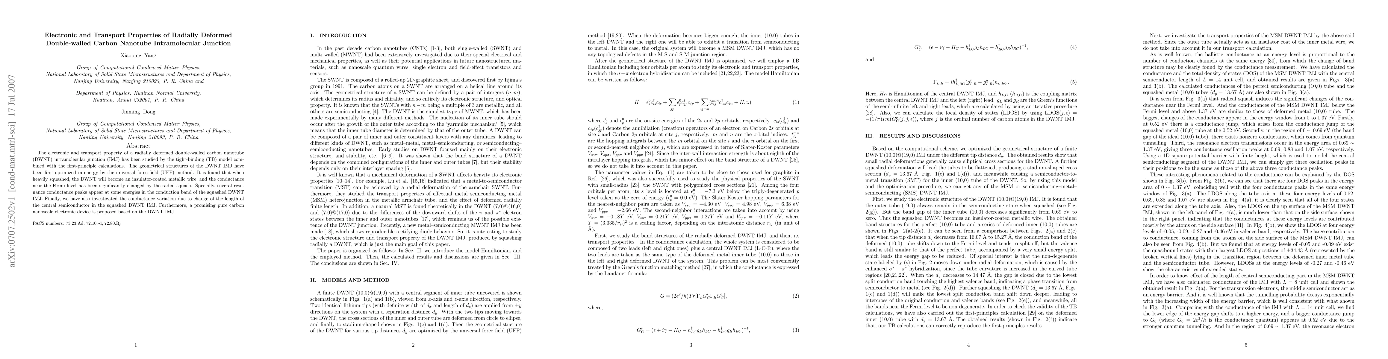 The electronic and transport property of a radially deformed double-walled carbon nanotube (DWNT) intramolecular junction (IMJ) has been studied by the tight-binding (TB) model combined with the first-principle calculations. The geometrical structures of the DWNT IMJ have been first optimized in energy by the universal force field (UFF) method. It is found that when heavily squashed, the DWNT will become an insulator-coated metallic wire, and the conductance near the Fermi level has been significantly changed by the radial squash. Specially, several resonance conductance peaks appear at some energies in the conduction band of the squashed DWNT IMJ. Finally, we have also investigated the conductance variation due to change of the length of the central semiconductor in the squashed DWNT IMJ. Furthermore, a promising pure carbon nanoscale electronic device is proposed based on the DWNT IMJ.
