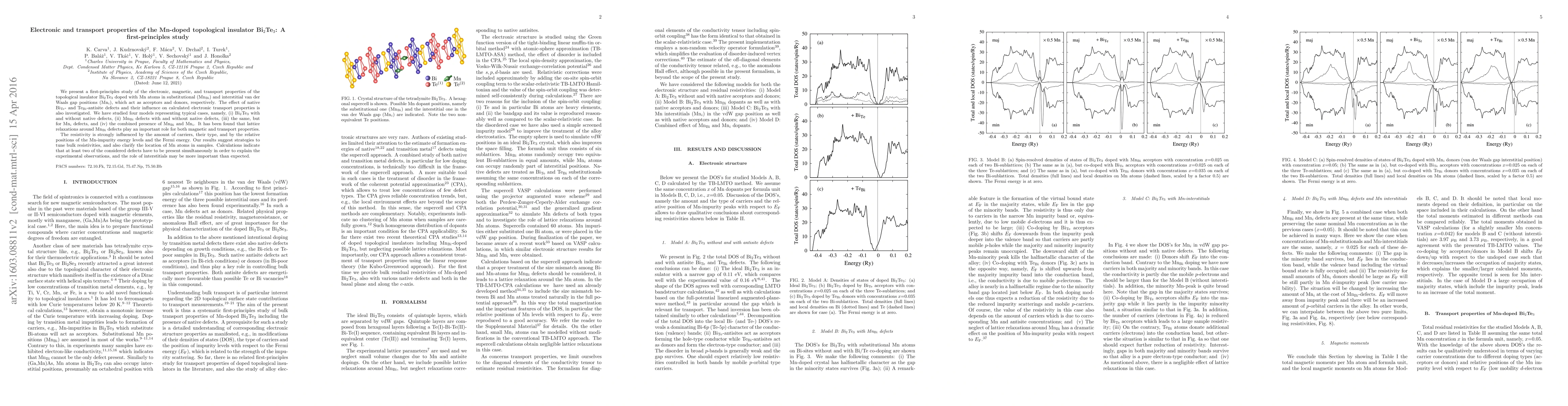 We present a first-principles study of the electronic, magnetic, and transport properties of the topological insulator Bi$_{2}$Te$_{3}$ doped with Mn atoms in substitutional (Mn$_{\rm Bi}$) and interstitial van der Waals gap positions (Mn$_{\rm i}$), which act as acceptors and donors, respectively. The effect of native Bi$_{\rm Te}$- and Te$_{\rm Bi}$-antisite defects and their influence on calculated electronic transport properties is also investigated. We have studied four models representing typical cases, namely (i) Bi$_{2}$Te$_{3}$ with and without native defects, (ii) Mn$_{\rm Bi}$ defects with and without native defects, (iii) the same but for Mn$_{\rm i}$ defects, and (iv) the combined presence of Mn$_{\rm Bi}$ and Mn$_{\rm i}$. It was found that lattice relaxations around Mn$_{\rm Bi}$ defects play an important role for both magnetic and transport properties. The resistivity is strongly influenced by the amount of carriers, their type, and by the relative positions of the Mn-impurity energy levels and the Fermi energy. Our results indicate strategies to tune bulk resistivities, and also help to uncover the location of Mn atoms in measured samples. Calculations indicate that at least two of the considered defects have to be present simultaneously in order to explain the experimental observations, and the role of interstitials may be more important than expected.