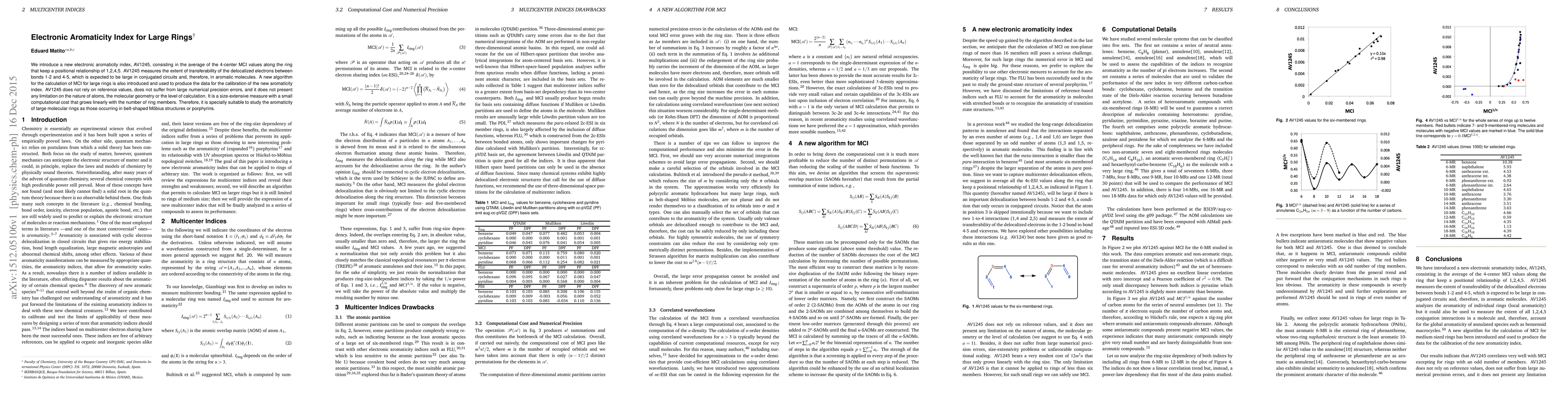 The paper introduces AV1245, a new electronic aromaticity index for large rings based on the average of 4-center MCI values, which measures electron delocalization. It is computationally efficient, size-extensive, and suitable for studying aromaticity in large molecular structures like Möbius belts and porphyrins.