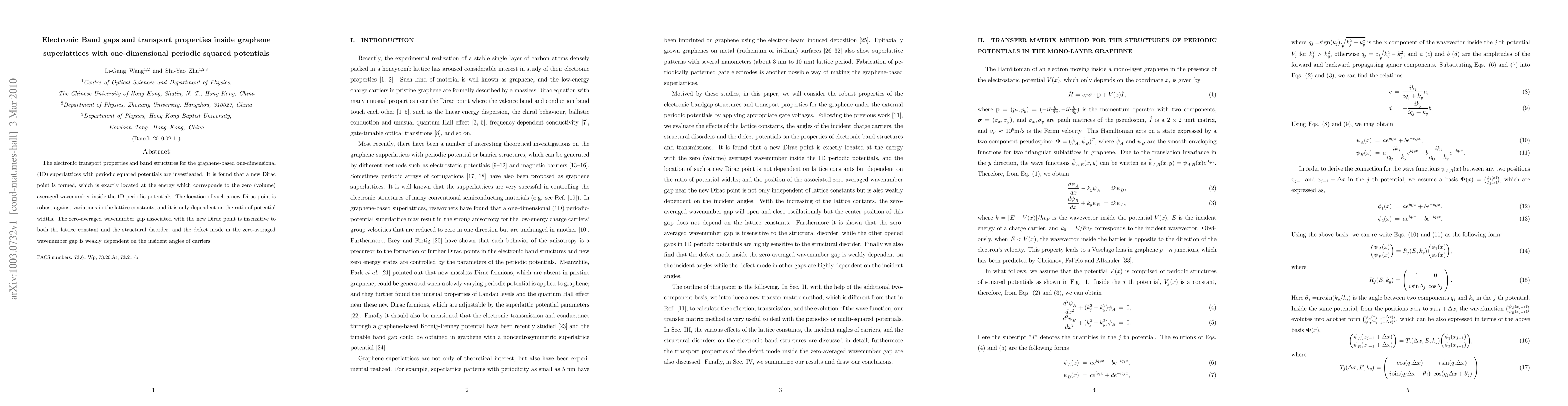 The electronic transport properties and band structures for the graphene-based one-dimensional (1D) superlattices with periodic squared potentials are investigated. It is found that a new Dirac point is formed, which is exactly located at the energy which corresponds to the zero (volume) averaged wavenumber inside the 1D periodic potentials. The location of such a new Dirac point is robust against variations in the lattice constants, and it is only dependent on the ratio of potential widths. The zero-averaged wavenumber gap associated with the new Dirac point is insensitive to both the lattice constant and the structural disorder, and the defect mode in the zero-averaged wavenumber gap is weakly dependent on the insident angles of carriers.