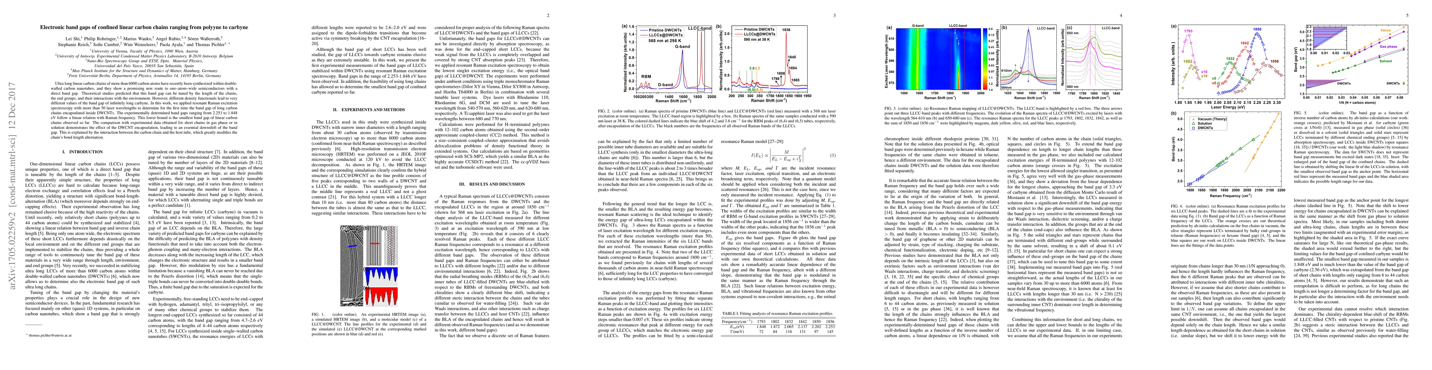 This paper reports the first experimental determination of the electronic band gaps of ultra-long linear carbon chains encapsulated within double-walled carbon nanotubes, finding a range from 2.253 to 1.848 eV, and attributes the observed band gap downshift to the interaction between the carbon chain and the host tube.