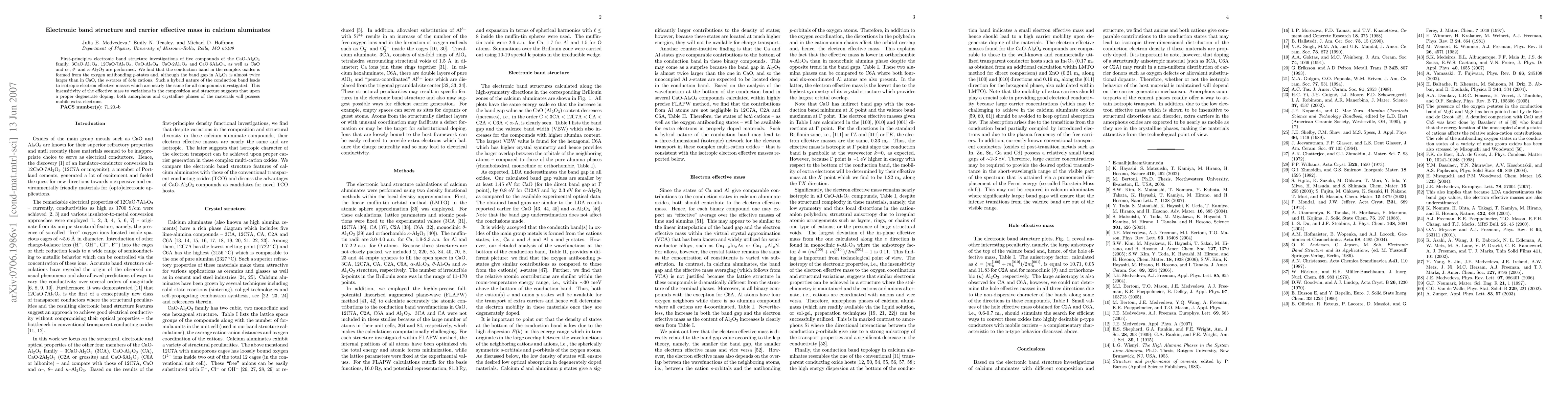 Researchers investigated electronic band structures in calcium aluminates, finding that conduction bands form from oxygen antibonding p-states, leading to isotropic electron effective masses across different compounds. This suggests amorphous and crystalline phases can possess mobile extra electrons through proper degenerate doping.