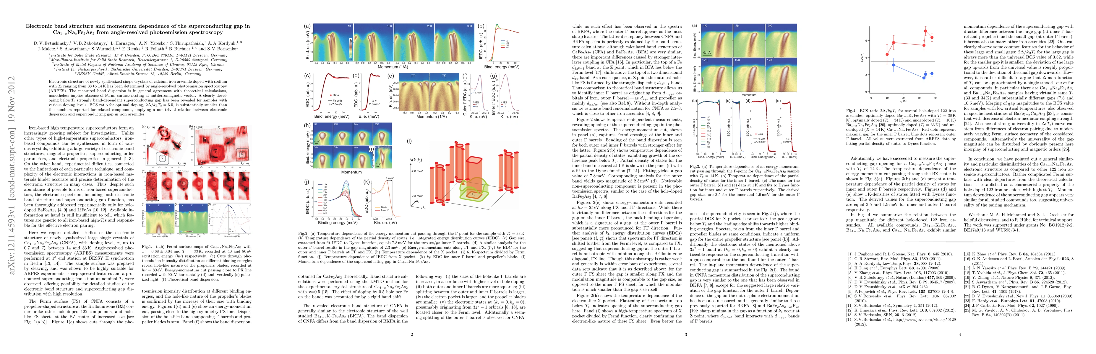 This study uses angle-resolved photoemission spectroscopy to determine the electronic structure of sodium-doped calcium iron arsenide, revealing a superconducting gap that varies with momentum and doping level. The BCS ratio for optimal doping is notably smaller than in related compounds, suggesting a complex relationship between electronic dispersion and superconductivity.