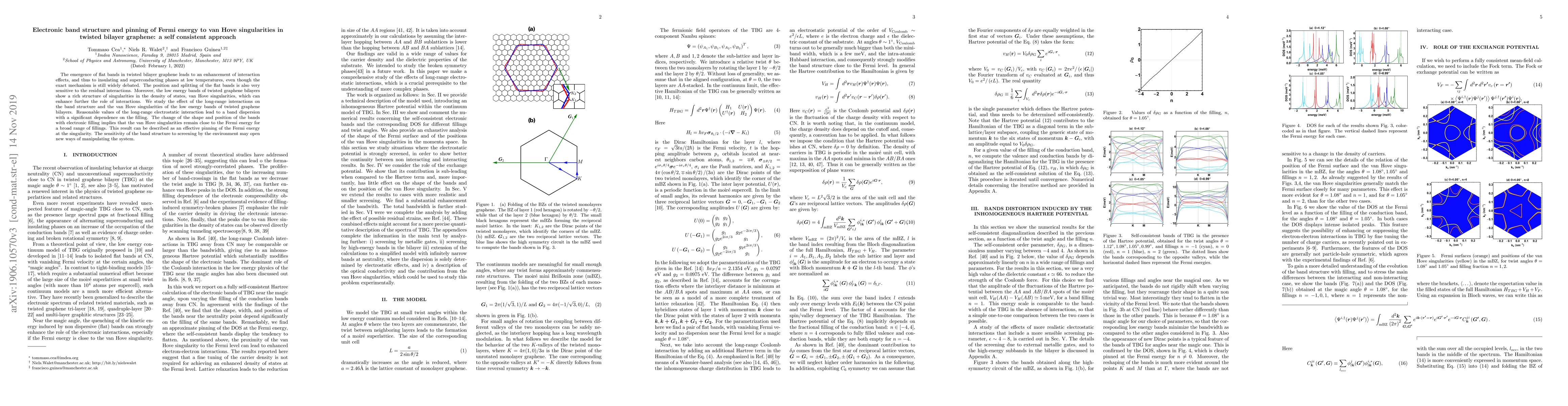 This paper investigates the electronic band structure of twisted bilayer graphene, focusing on how long-range interactions affect the Fermi energy, which is pinned near van Hove singularities over a wide range of fillings, potentially enabling new manipulation methods.