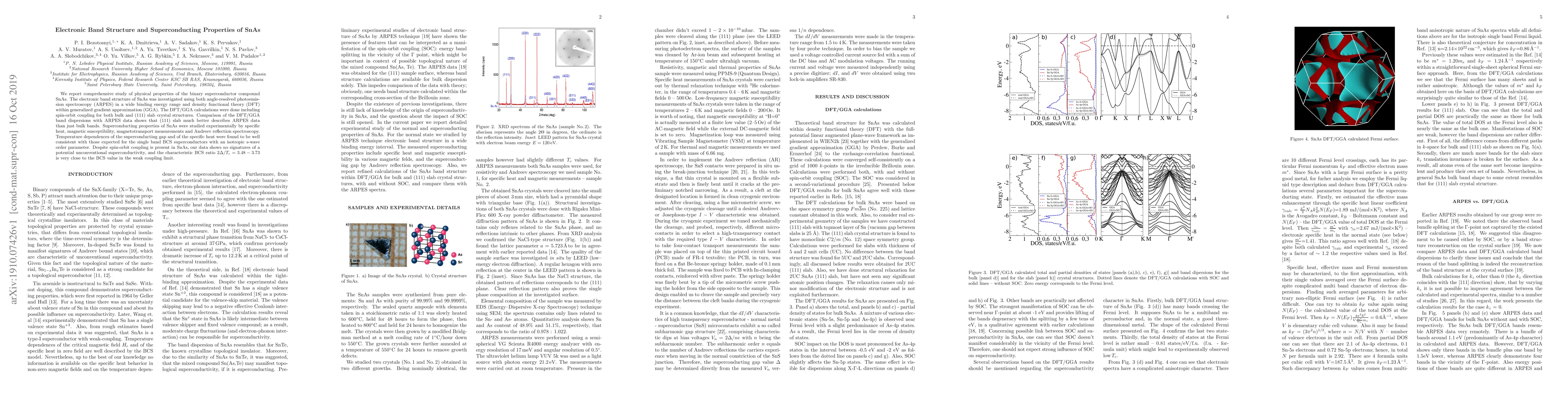 This study investigates the electronic band structure and superconducting properties of SnAs using ARPES and DFT/GGA, finding that the (111) slab structure better matches experimental data. SnAs exhibits conventional s-wave superconductivity with a BCS ratio close to the theoretical value, despite the presence of spin-orbit coupling.