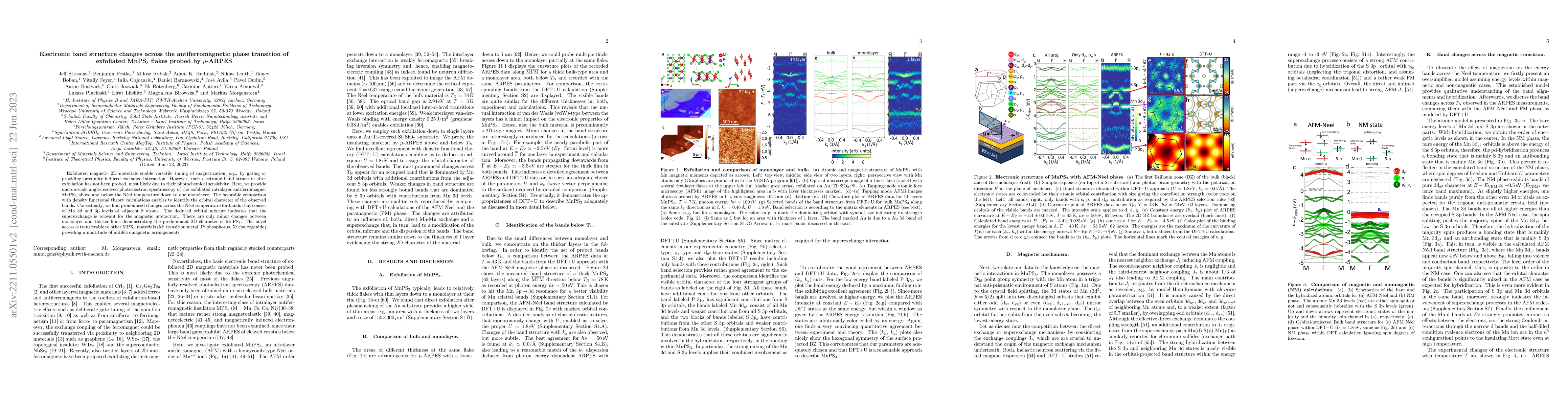 Exfoliated magnetic 2D materials enable versatile tuning of magnetization, e.g., by gating or providing proximity-induced exchange interaction. However, their electronic band structure after exfoliation has not been probed, most likely due to their photochemical sensitivity. Here, we provide micron-scale angle-resolved photoelectron spectroscopy of the exfoliated intralayer antiferromagnet MnPS$_3$ above and below the N\'{e}el temperature down to one monolayer. The favorable comparison with density functional theory calculations enables to identify the orbital character of the observed bands. Consistently, we find pronounced changes across the N\'{e}el temperature for bands that consist of Mn 3d and 3p levels of adjacent S atoms. The deduced orbital mixture indicates that the superexchange is relevant for the magnetic interaction. There are only minor changes between monolayer and thicker films demonstrating the predominant 2D character of MnPS$_3$. The novel access is transferable to other MPX$_3$ materials (M: transition metal, P: phosphorus, X: chalcogenide) providing a multitude of antiferromagnetic arrangements.