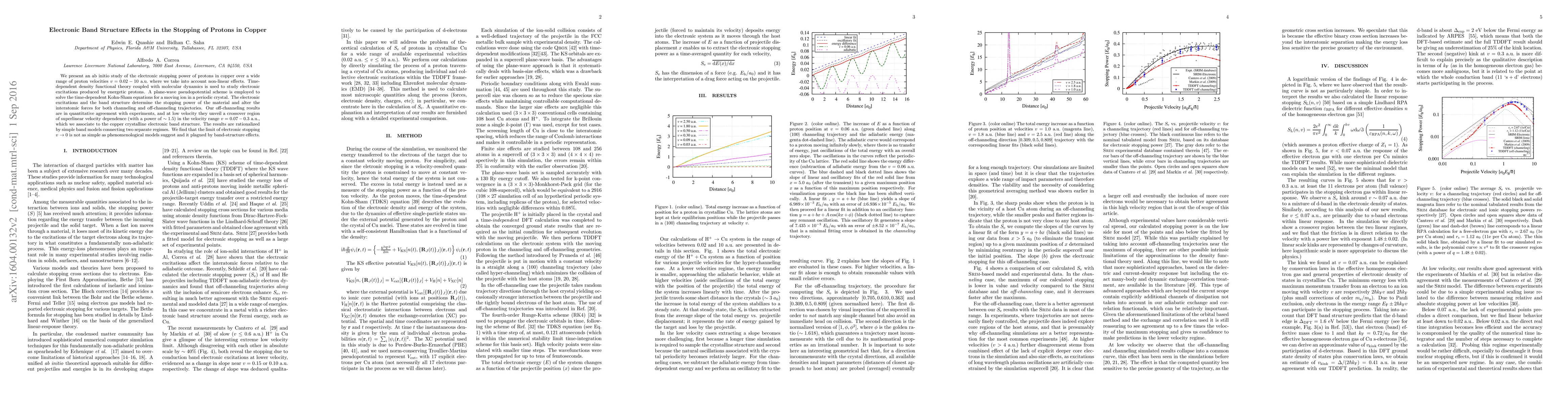 We present an ab initio study of the electronic stopping power of protons in copper over a wide range of proton velocities $v = 0.02-10~\mathrm{a.u.}$ where we take into account non-linear effects. Time-dependent density functional theory coupled with molecular dynamics is used to study electronic excitations produced by energetic protons. A plane-wave pseudopotential scheme is employed to solve the time-dependent Kohn-Sham equations for a moving ion in a periodic crystal. The electronic excitations and the band structure determine the stopping power of the material and alter the interatomic forces for both channeling and off-channeling trajectories. Our off-channeling results are in quantitative agreement with experiments, and at low velocity they unveil a crossover region of superlinear velocity dependence (with a power of $\sim 1.5$) in the velocity range $v = 0.07-0.3~\mathrm{a.u.}$, which we associate to the copper crystalline electronic band structure. The results are rationalized by simple band models connecting two separate regimes. We find that the limit of electronic stopping $v\to 0$ is not as simple as phenomenological models suggest and it plagued by band-structure effects.