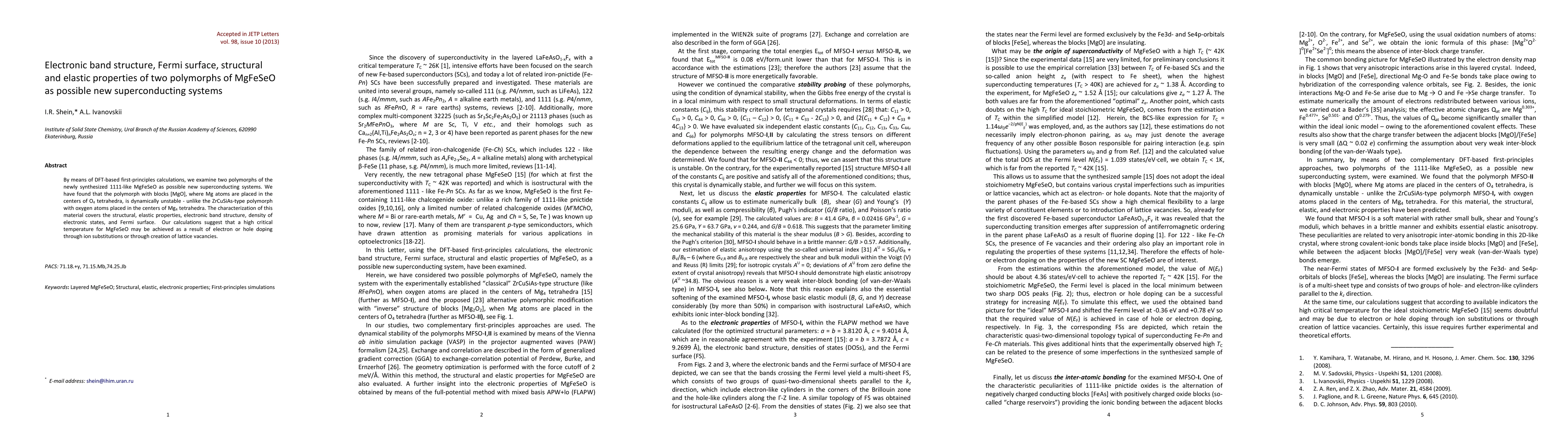 By means of DFT-based first-principles calculations, we examine two polymorphs of the newly synthesized 1111-like MgFeSeO as possible new superconducting systems. We have found that the polymorph with blocks [MgO], where Mg atoms are placed in the centers of O4 tetrahedra, is dynamically unstable - unlike the ZrCuSiAs-type polymorph with oxygen atoms placed in the centers of Mg4 tetrahedra. The characterization of this material covers the structural, elastic properties, electronic band structure, density of electronic states, and Fermi surface. Our calculations suggest that a high critical temperature for MgFeSeO may be achieved as a result of electron or hole doping through ion substitutions or through creation of lattice vacancies.