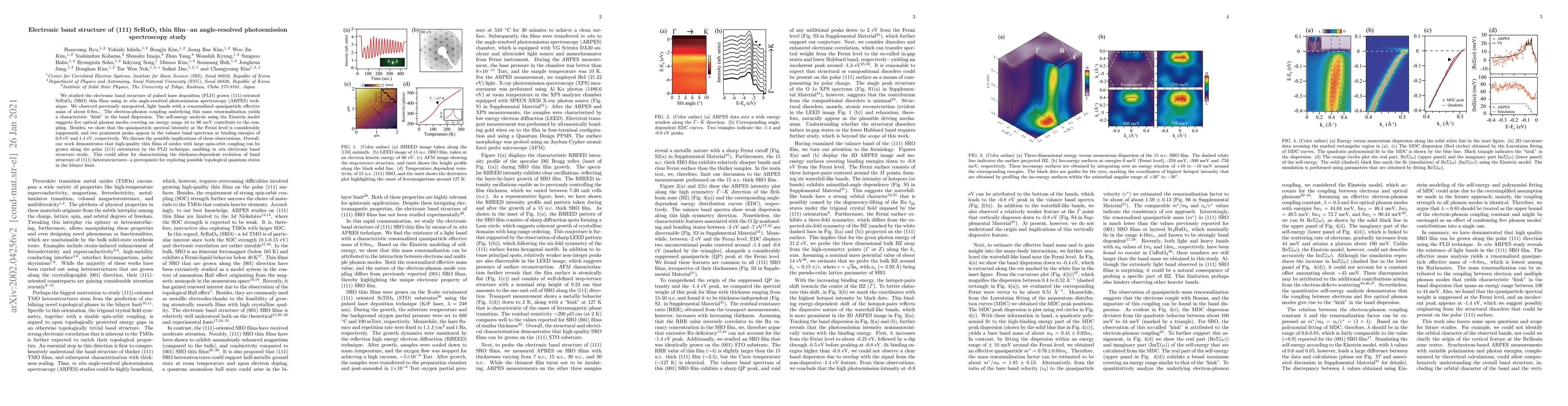 We studied the electronic band structure of pulsed laser deposition (PLD) grown (111)-oriented SrRuO$_3$ (SRO) thin films using \textit{in situ} angle-resolved photoemission spectroscopy (ARPES) technique. We observed previously unreported, light bands with a renormalized quasiparticle effective mass of about 0.8$m_{e}$. The electron-phonon coupling underlying this mass renormalization yields a characteristic "kink" in the band dispersion. The self-energy analysis using the Einstein model suggests five optical phonon modes covering an energy range 44 to 90 meV contribute to the coupling. Besides, we show that the quasiparticle spectral intensity at the Fermi level is considerably suppressed, and two prominent peaks appear in the valance band spectrum at binding energies of 0.8 eV and 1.4 eV, respectively. We discuss the possible implications of these observations. Overall, our work demonstrates that high-quality thin films of oxides with large spin-orbit coupling can be grown along the polar (111) orientation by the PLD technique, enabling \textit{in situ} electronic band structure study. This could allow for characterizing the thickness-dependent evolution of band structure of (111) heterostructures$-$a prerequisite for exploring possible topological quantum states in the bilayer limit.