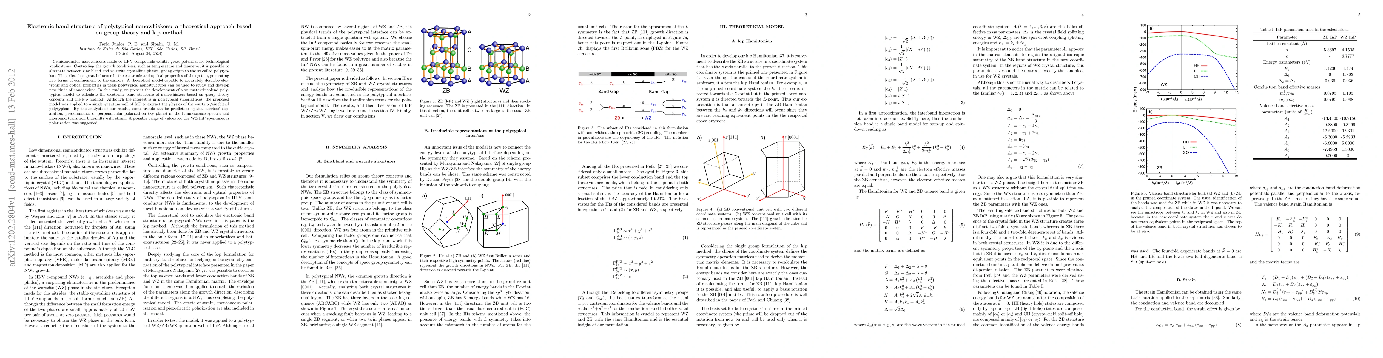 Semiconductor nanowhiskers made of III-V compounds exhibit great potential for technological applications. Controlling the growth conditions, such as temperature and diameter, it is possible to alternate between zinc blend and wurtzite crystalline phases, giving origin to the so called polytypism. This effect has great influence in the electronic and optical properties of the system, generating new forms of confinement to the carriers. A theoretical model capable to accurately describe electronic and optical properties in these polytypical nanostructures can be used to study and develop new kinds of nanodevices. In this study, we present the development of a wurtzite/zincblend polytypical model to calculate the electronic band structure of nanowhiskers based on group theory concepts and the k$\cdot$p method. Although the interest is in polytypical superlattices, the proposed model was applied to a single quantum well of InP to extract the physics of the wurtzite/zincblend polytypism. By the analysis of our results, some trends can be predicted: spatial carriers' separation, predominance of perpendicular polarization (xy plane) in the luminescence spectra and interband transition blueshifts with strain. A possible range of values for the WZ InP spontaneous polarization was suggested.