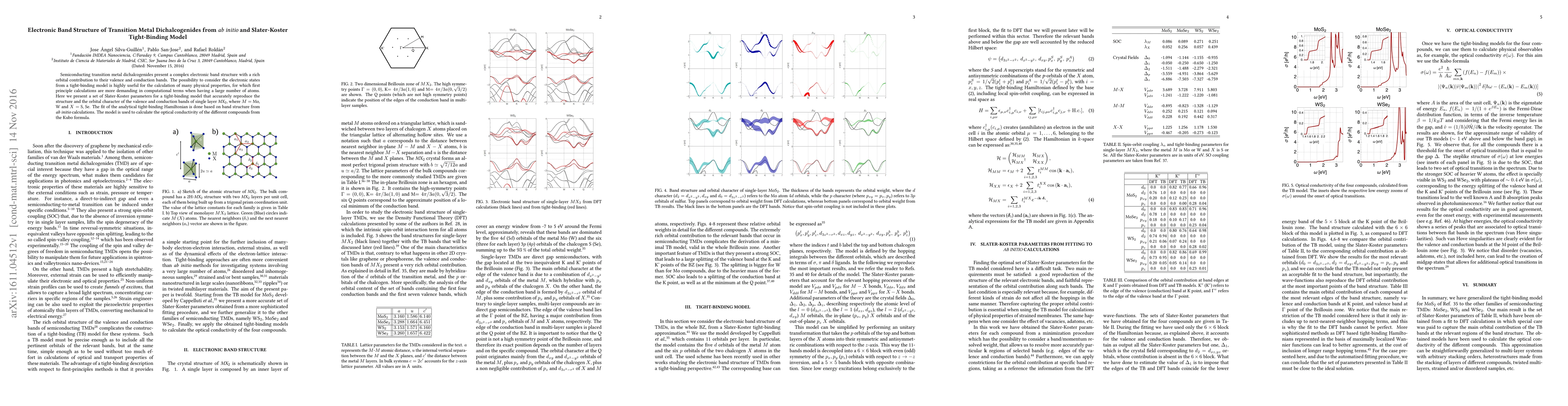 This study develops a Slater-Koster tight-binding model to reproduce the electronic band structure of transition metal dichalcogenides from ab initio calculations, facilitating the computation of physical properties like optical conductivity. The model's parameters are fitted to accurately represent the orbital contributions in the valence and conduction bands of MX$_2$ (M = Mo, W; X = S, Se) layers.