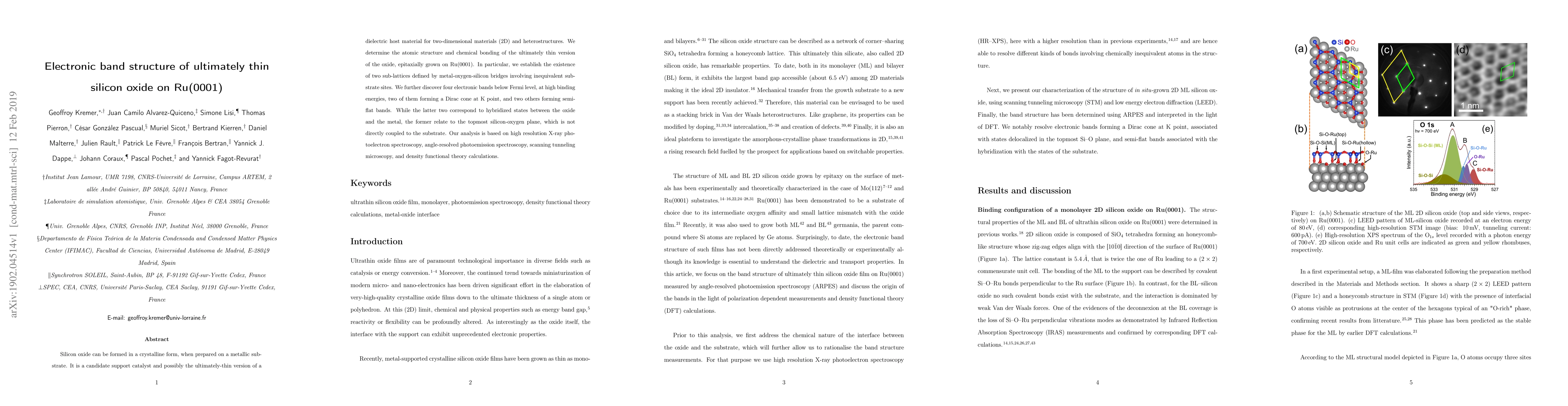 This study investigates the electronic band structure of ultra-thin silicon oxide on Ru(0001), revealing four electronic bands below the Fermi level, including a Dirac cone and semi-flat bands, with the latter arising from oxide-metal hybridization. The research combines experimental techniques and theoretical calculations to elucidate the atomic structure and chemical bonding.