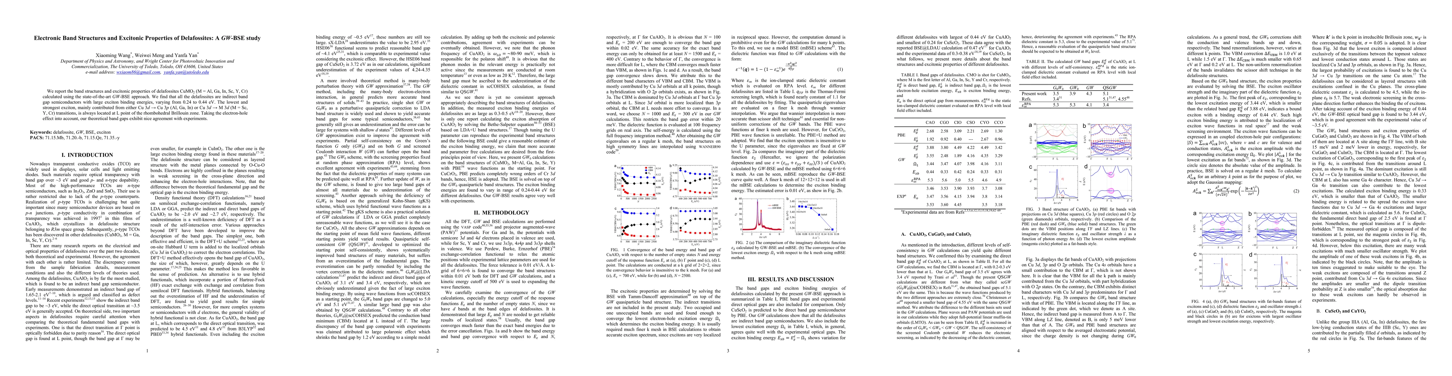 We report the band structures and excitonic properties of delafossites $CuMO_2$ (M = Al, Ga, In, Sc, Y, Cr) calculated using the state-of-the-art $\textit{GW}$-BSE approach. We find that all the delafossites are indirect band gap semiconductors with large exciton binding energies, varying from 0.24 to 0.44 eV. The lowest and strongest exciton, mainly contributed from either Cu 3$\textit{d}$ $\rightarrow$ Cu 3$\textit{p}$ (Al, Ga, In) or Cu 3$\textit{d}$ $\rightarrow$ M 3$\textit{d}$ (M = Sc, Y, Cr) transitions, is always located at $L$ point of the rhombohedral Brillouin zone. Taking the electron-hole effect into account, our theoretical band gaps exhibit nice agreement with experiments.