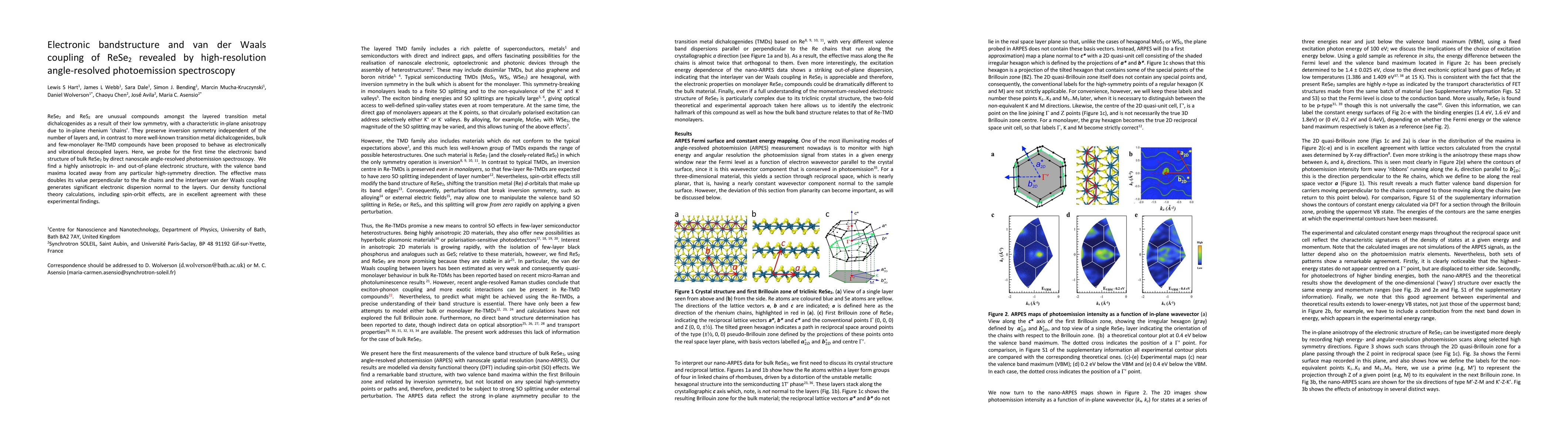 This paper investigates the electronic band structure of bulk ReSe2 using high-resolution angle-resolved photoemission spectroscopy, revealing significant anisotropic in-plane and out-of-plane electronic properties and substantial interlayer van der Waals coupling effects, corroborated by density functional theory calculations.