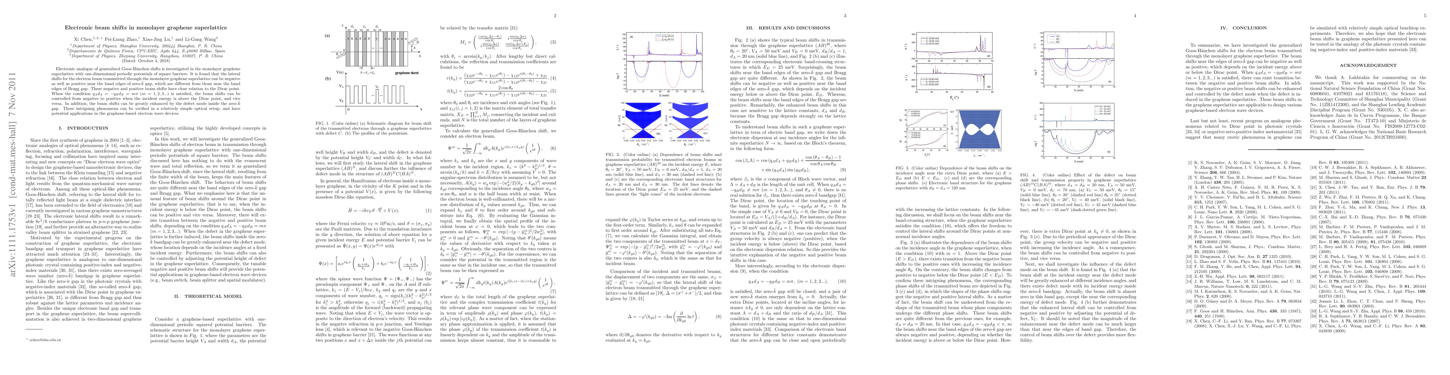 This paper investigates electronic beam shifts in monolayer graphene superlattices with periodic potentials, revealing that shifts can be negative or positive near the band edges, particularly influenced by the Dirac point. The shifts can be controlled and enhanced by specific conditions and defect modes, with potential applications in graphene-based electron wave devices.