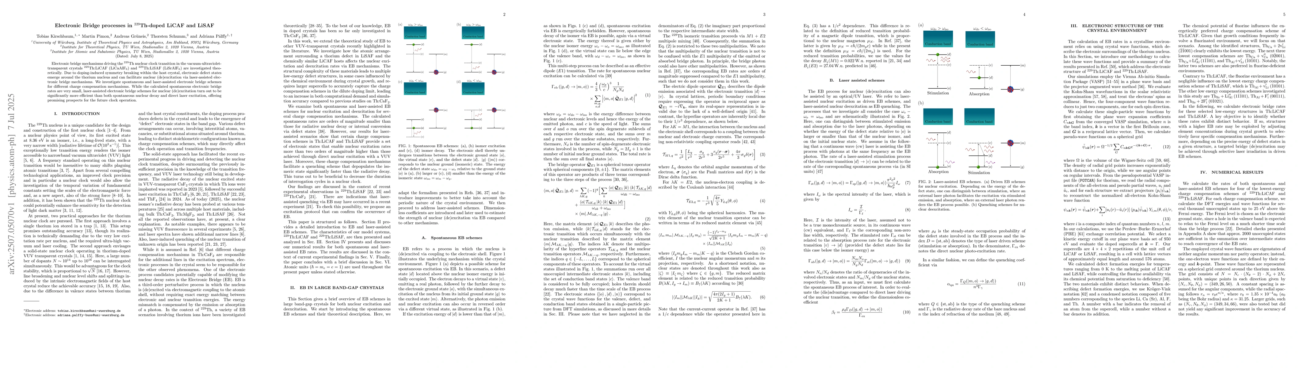 Electronic bridge mechanisms driving the $^{229}$Th nuclear clock transition in the vacuum-ultraviolet-transparent crystals $^{229}$Th:LiCAF (LiCaAlF$_6$) and $^{229}$Th:LiSAF (LiSrAlF$_6$) are investigated theoretically. Due to doping-induced symmetry breaking within the host crystal, electronic defect states emerge around the thorium nucleus and can facilitate nuclear (de)excitation via laser-assisted electronic bridge mechanisms. We investigate spontaneous and laser-assisted electronic bridge schemes for different charge compensation mechanisms. While the calculated spontaneous electronic bridge rates are very small, laser-assisted electronic bridge schemes for nuclear (de)excitation turn out to be significantly more efficient than both spontaneous nuclear decay and direct laser excitation, offering promising prospects for the future clock operation.