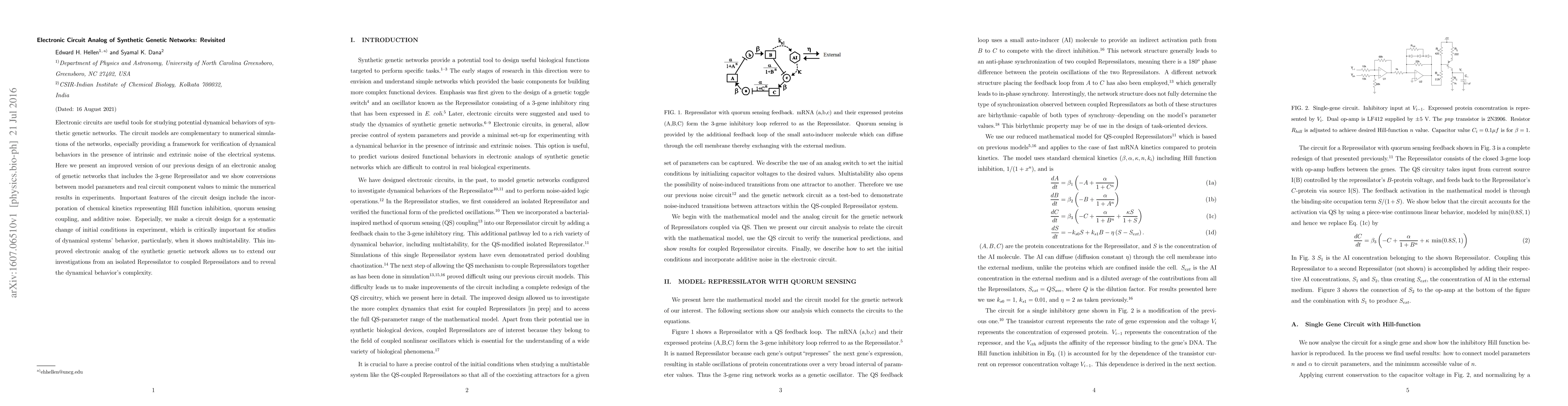 Electronic circuits are useful tools for studying potential dynamical behaviors of synthetic genetic networks. The circuit models are complementary to numerical simulations of the networks, especially providing a framework for verification of dynamical behaviors in the presence of intrinsic and extrinsic noise of the electrical systems. Here we present an improved version of our previous design of an electronic analog of genetic networks that includes the 3-gene Repressilator and we show conversions between model parameters and real circuit component values to mimic the numerical results in experiments. Important features of the circuit design include the incorporation of chemical kinetics representing Hill function inhibition, quorum sensing coupling, and additive noise. Especially, we make a circuit design for a systematic change of initial conditions in experiment, which is critically important for studies of dynamical systems' behavior, particularly, when it shows multistability. This improved electronic analog of the synthetic genetic network allows us to extend our investigations from an isolated Repressilator to coupled Repressilators and to reveal the dynamical behavior's complexity.