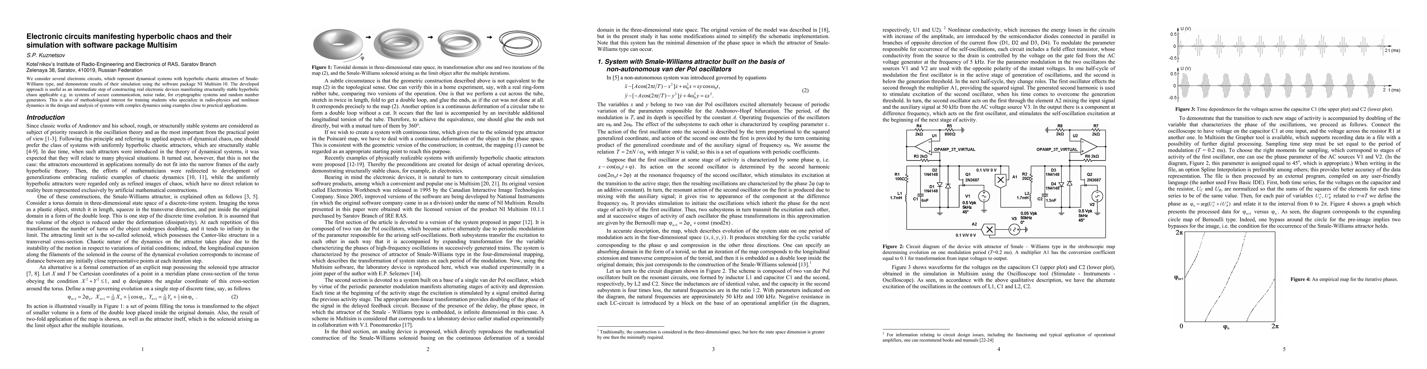 We consider several electronic circuits, which represent dynamical systems with hyperbolic chaotic attractors of Smale-Williams type, and demonstrate results of their simulation using the software package NI Multisim 10. The developed approach is useful as an intermediate step of constructing real electronic devices manifesting structurally stable hyperbolic chaos applicable e.g. in systems of secure communication, noise radar, for cryptographic systems and random number generators. This is also of methodological interest for training students who specialize in radio-physics and nonlinear dynamics in the design and analysis of systems with complex dynamics using examples close to practical applications.