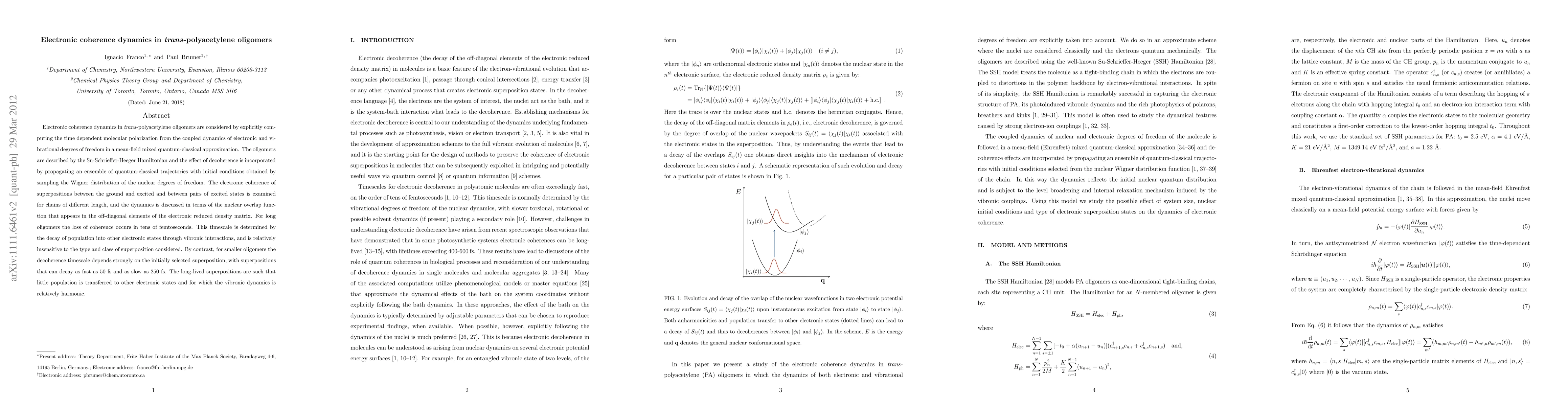 This paper investigates electronic decoherence dynamics in trans-polyacetylene oligomers using a mixed quantum-classical approach. It reveals that the coherence loss timescale varies significantly with oligomer length and the specific electronic state superposition, ranging from 50 fs to 250 fs for smaller oligomers.
