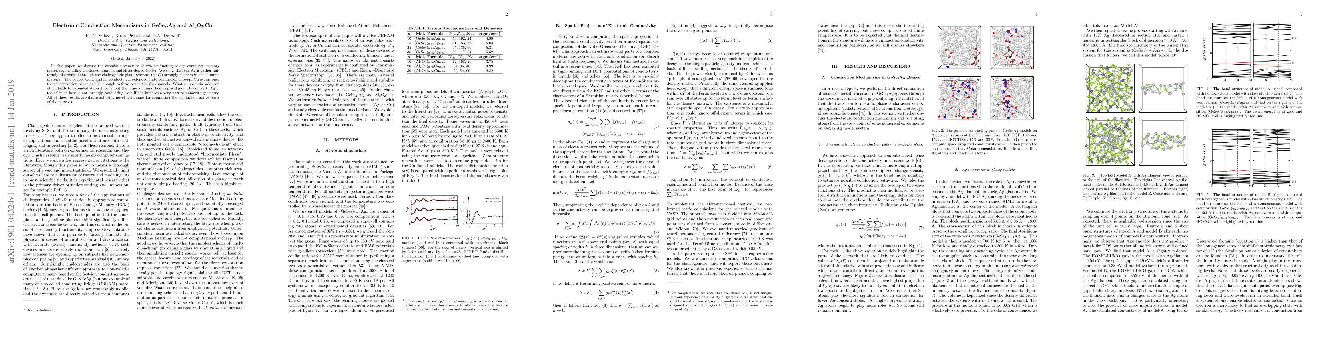 This research examines two conductive bridge memory materials: Cu-doped alumina and Ag-doped GeSe$_3$. It finds that Cu forms clusters in alumina, creating conductive channels, while Ag in GeSe$_3$ does not significantly enhance conductivity. The study employs novel methods to compute conduction-active network parts.