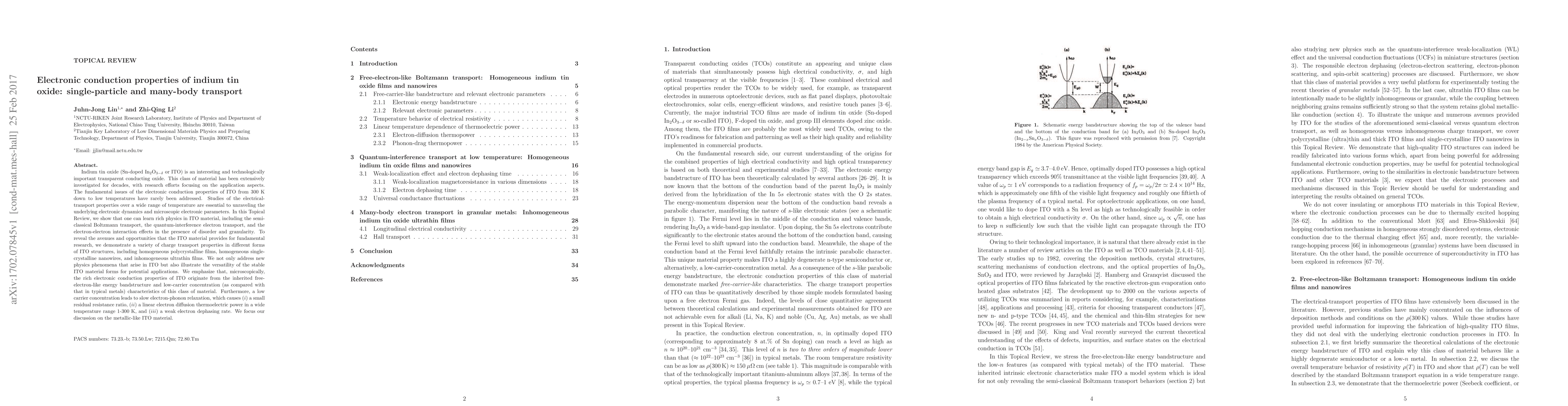 This paper explores the electronic conduction properties of indium tin oxide (ITO) across various forms, revealing rich physics including semi-classical and quantum-interference transport, and electron-electron interactions. It highlights ITO's versatile applications and fundamental research potential due to its free-electron-like band structure and low carrier concentration.