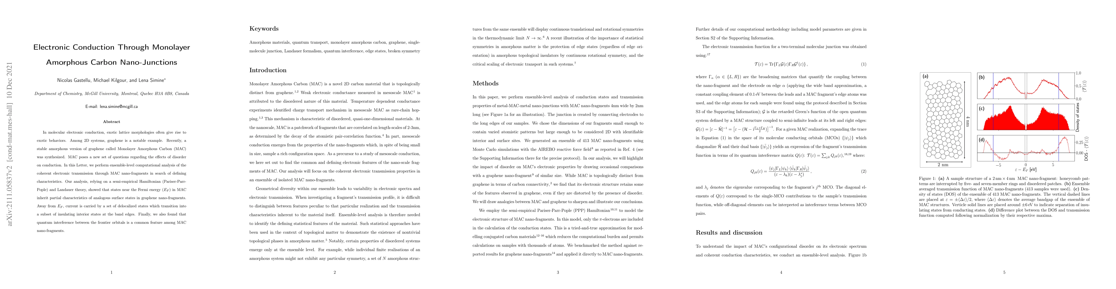 Researchers analyzed electronic conduction through Monolayer Amorphous Carbon nano-junctions, finding states near the Fermi energy inherit characteristics from graphene and current is carried by delocalized states away from it.