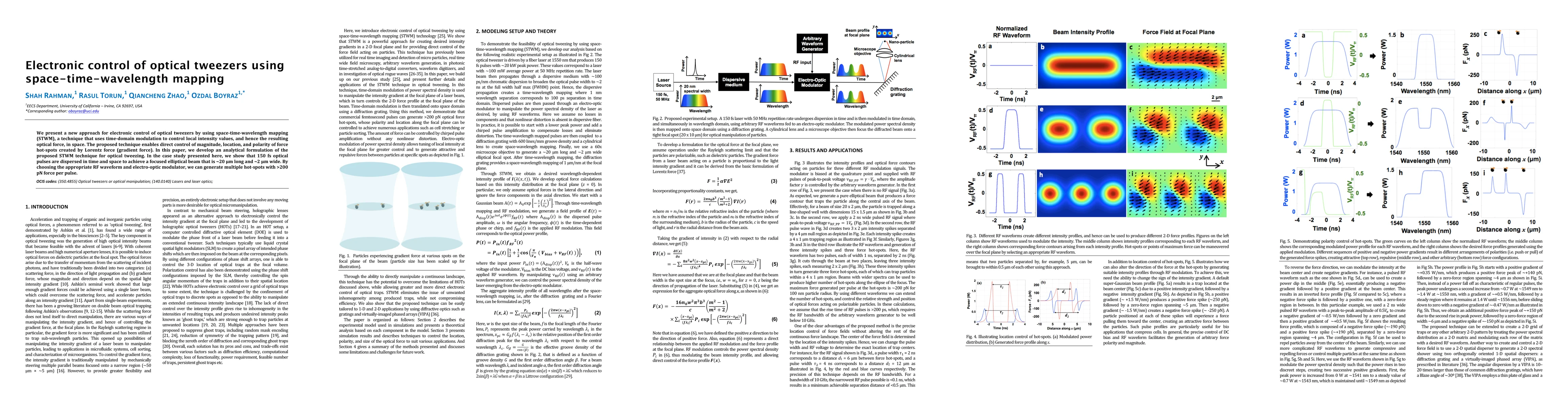 We present a new approach for electronic control of optical tweezers by using space-time-wavelength mapping (STWM), a technique that uses time-domain modulation to control local intensity values, and hence the resulting optical force, in space. The proposed technique enables direct control of magnitude, location, and polarity of force hot-spots created by Lorentz force (gradient force). In this paper, we develop an analytical formulation of the proposed STWM technique for optical tweezing. In the case study presented here, we show that 150 fs optical pulses are dispersed in time and space to achieve a focused elliptical beam that is ~20 {\mu}m long and ~2 {\mu}m wide. By choosing the appropriate RF waveform and electro-optic modulator, we can generate multiple hot-spots with >200 pN force per pulse.