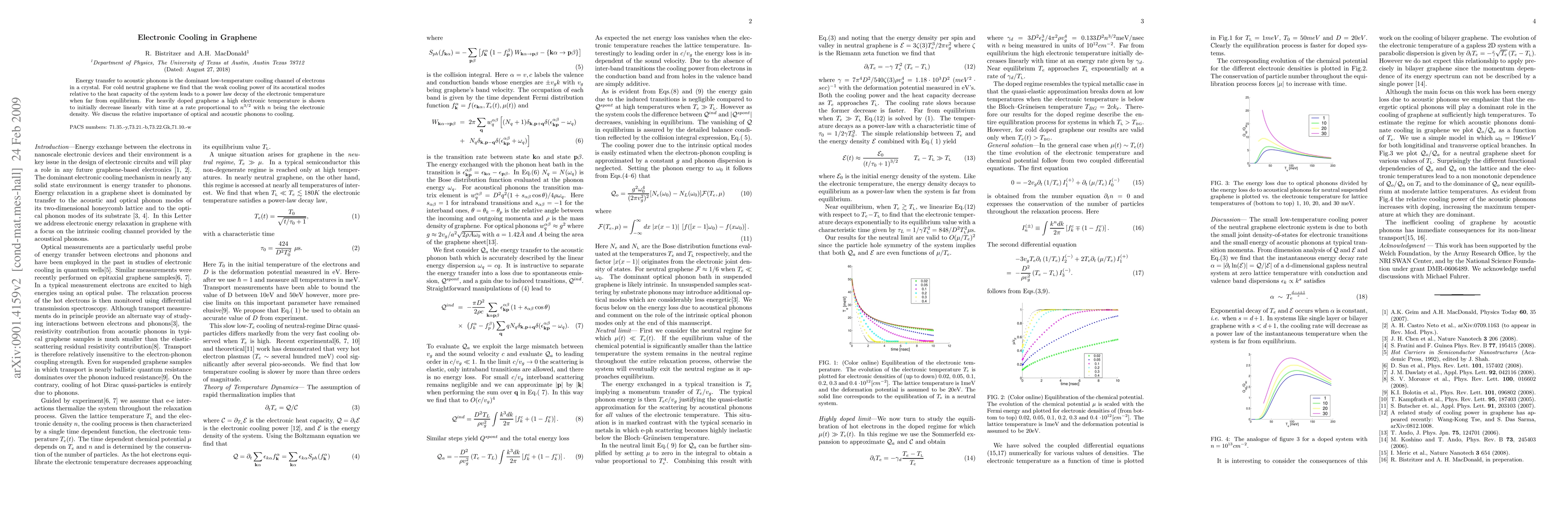 This paper explores the cooling mechanisms in graphene, finding that low-temperature electron cooling is primarily through acoustic phonons. Heavily doped graphene exhibits a cooling rate proportional to n^(3/2), where n is the electronic density, highlighting the differing roles of optical and acoustic phonons in cooling.