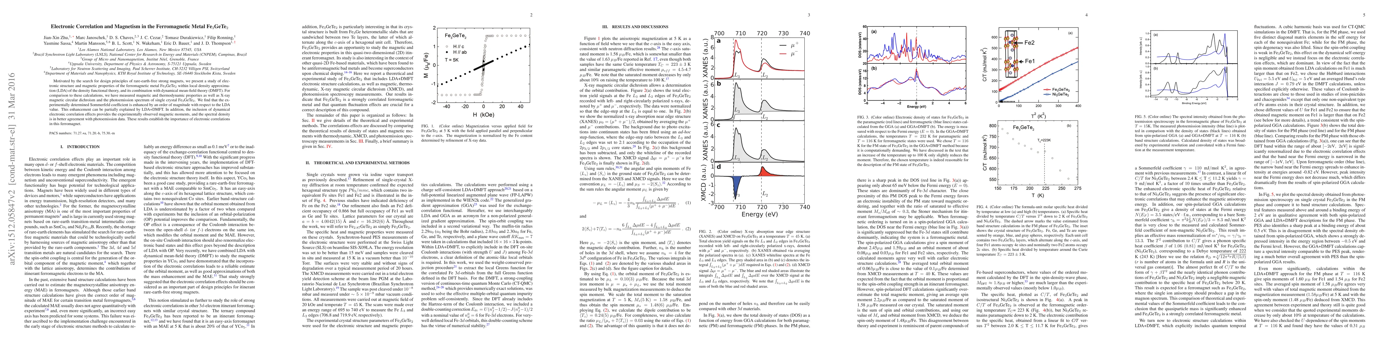 Motivated by the search for design principles of rare-earth-free strong magnets, we present a study of electronic structure and magnetic properties of the ferromagnetic metal Fe3GeTe2 within local density approximation (LDA) of the density functional theory, and its combination with dynamical mean-field theory (DMFT). For comparison to these calculations, we have measured magnetic and thermodynamic properties as well as X-ray magnetic circular dichroism and the photoemission spectrum of single crystal Fe3GeTe2. We find that the experimentally determined Sommerfeld coefficient is enhanced by an order of magnitude with respect to the LDA value. This enhancement can be partially explained by LDA+DMFT. In addition, the inclusion of dynamical electronic correlation effects provides the experimentally observed magnetic moments, and the spectral density is in better agreement with photoemission data. These results establish the importance of electronic correlations in this ferromagnet.