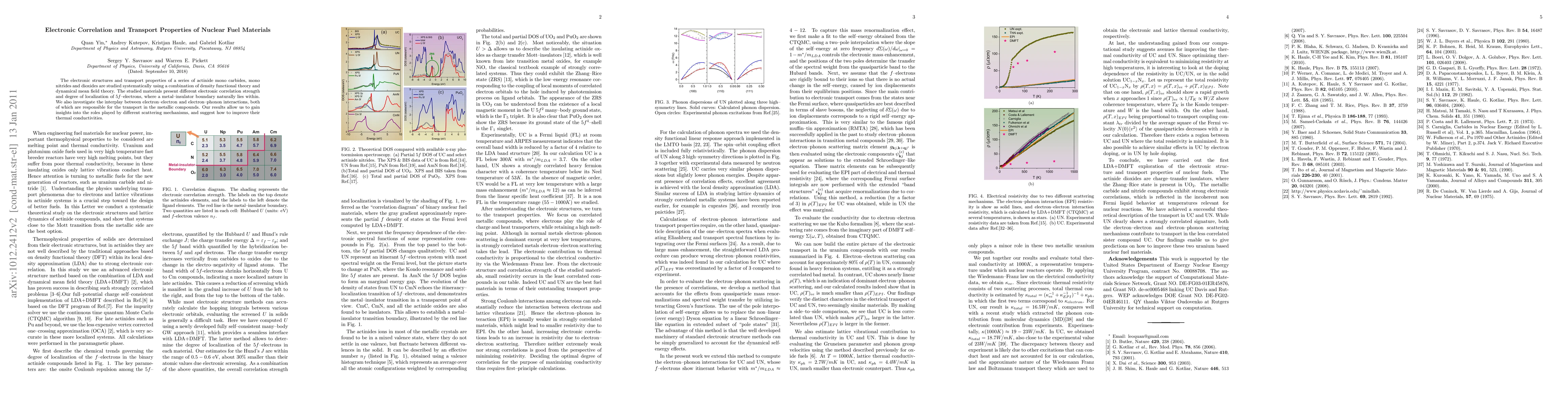 This paper investigates the electronic correlation and transport properties of actinide nuclear fuel materials using the LDA+DMFT method. It identifies that electron-electron and electron-phonon interactions significantly influence the transport in uranium nitride and carbide, which are top candidates for nuclear fuel due to their superior thermophysical properties.