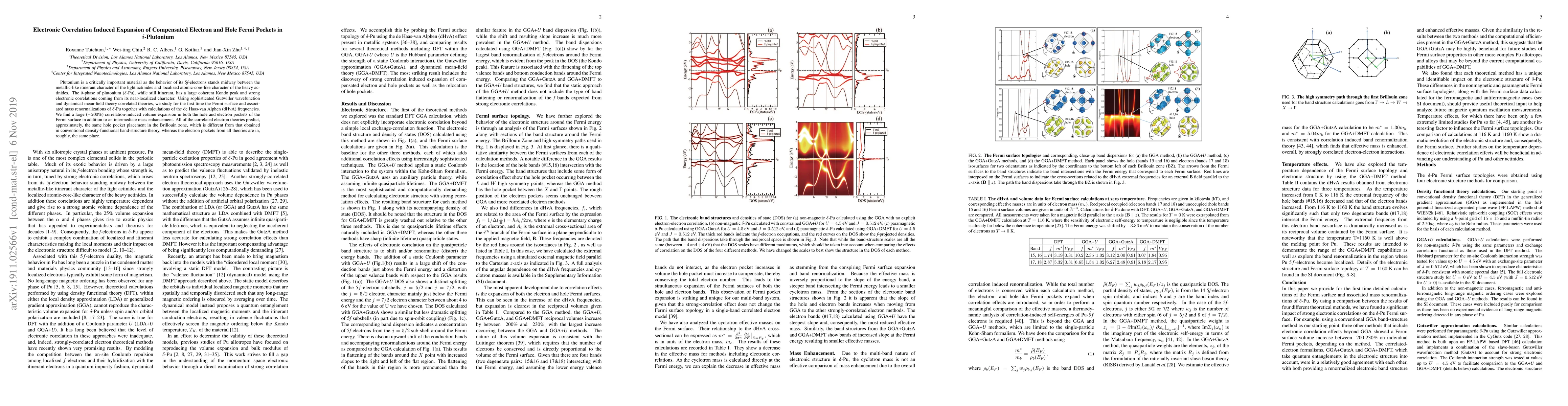 This paper investigates the electronic correlation effects in delta-phase plutonium (delta-Pu), revealing a significant (200%) expansion in both electron and hole Fermi pockets due to strong electronic correlations, alongside intermediate mass enhancement, as determined by advanced theoretical methods.