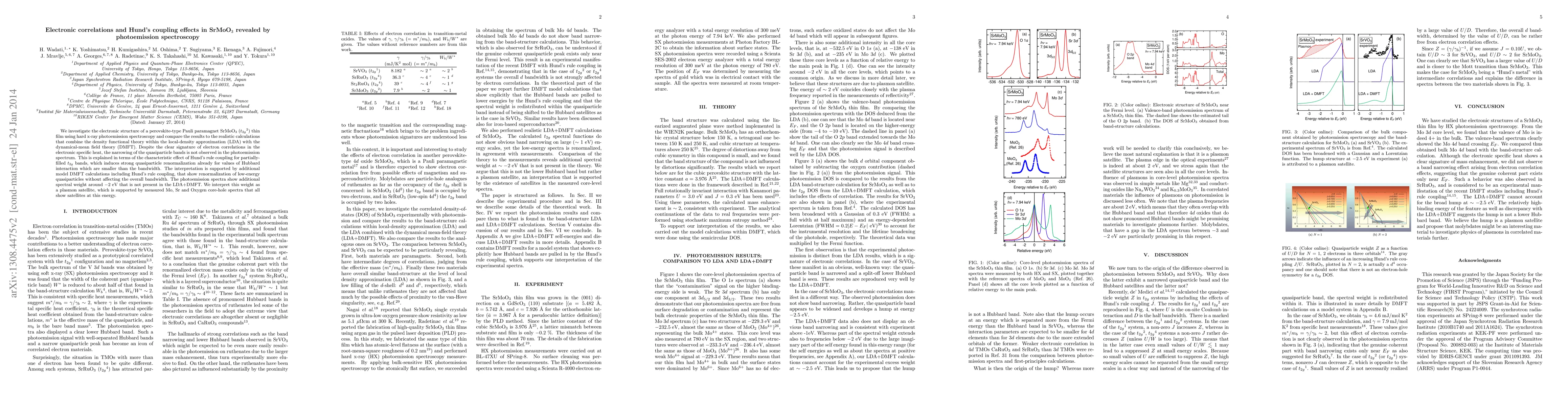 We investigate the electronic structure of a perovskite-type Pauli paramagnet SrMoO3 (t2g2) thin film using hard x-ray photoemission spectroscopy and compare the results to the realistic calculations that combine the density functional theory within the local-density approximation (LDA) with the dynamical-mean field theory (DMFT). Despite the clear signature of electron correlations in the electronic specific heat, the narrowing of the quasiparticle bands is not observed in the photoemission spectrum. This is explained in terms of the characteristic effect of Hund's rule coupling for partially-filled t2g bands, which induces strong quasiparticle renormalization already for values of Hubbard interaction which are smaller than the bandwidth. The interpretation is supported by additional model DMFT calculations including Hund's rule coupling, that show renormalization of low-energy quasiparticles without affecting the overall bandwidth. The photoemission spectra show additional spectral weight around -2 eV that is not present in the LDA+DMFT. We interpret this weight as a plasmon satellite, which is supported by measured Mo, Sr and Oxygen core-hole spectra that all show satellites at this energy.