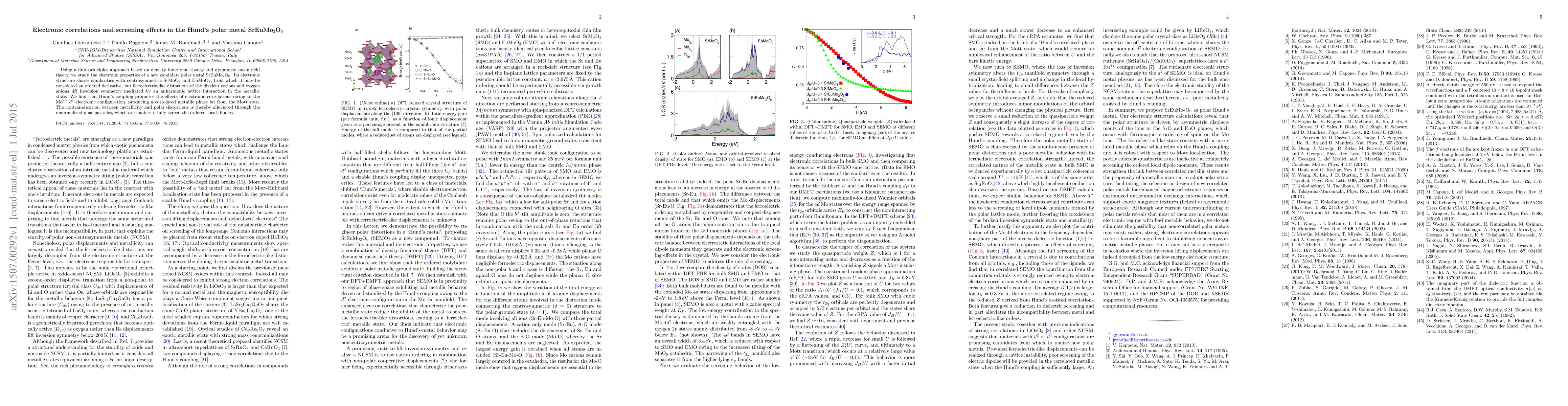 This paper investigates SrEuMo$_2$O$_6$ using first-principles density functional theory and dynamical mean field theory, revealing that electronic correlations driven by Hund's coupling in the Mo$^{4+}$ $d^{2}$ configuration lead to a metallic phase despite polar distortions. The quasiparticles fail to fully screen the local dipoles, balancing the contradiction between metallicity and polar distortions.