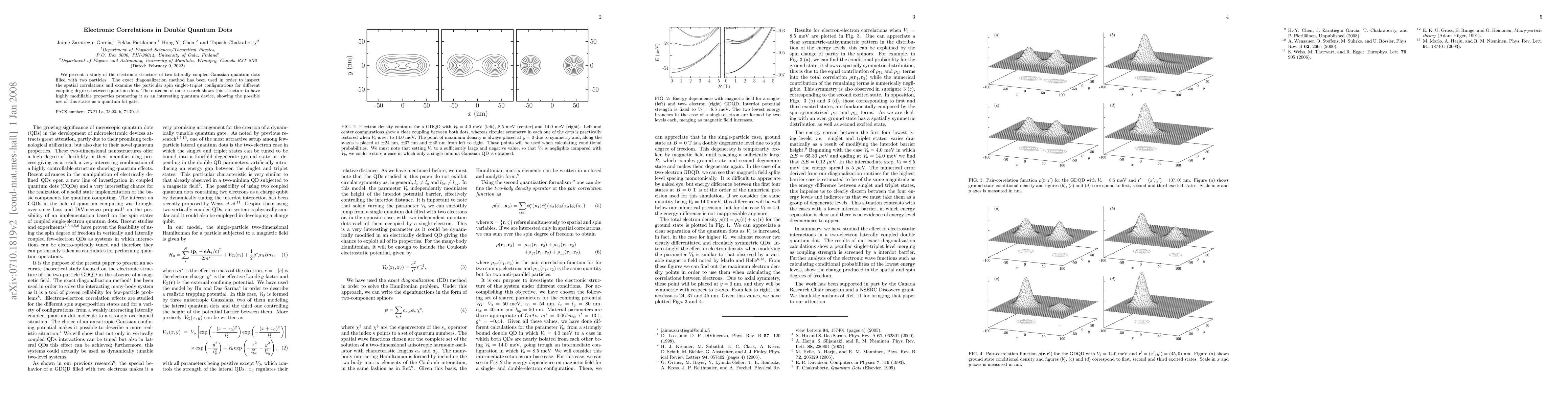 We present a study of the electronic structure of two laterally coupled gaussian quantum dots filled with two particles. The exact diagonalization method has been used in order to inspect the spatial correlations and examine the particular spin singlet-triplet configurations for different coupling degrees between quantum dots. The outcome of our research shows this structure to have highly modifiable properties promoting it as an interesting quantum device, showing the possible use of this states as a quantum bit gate.