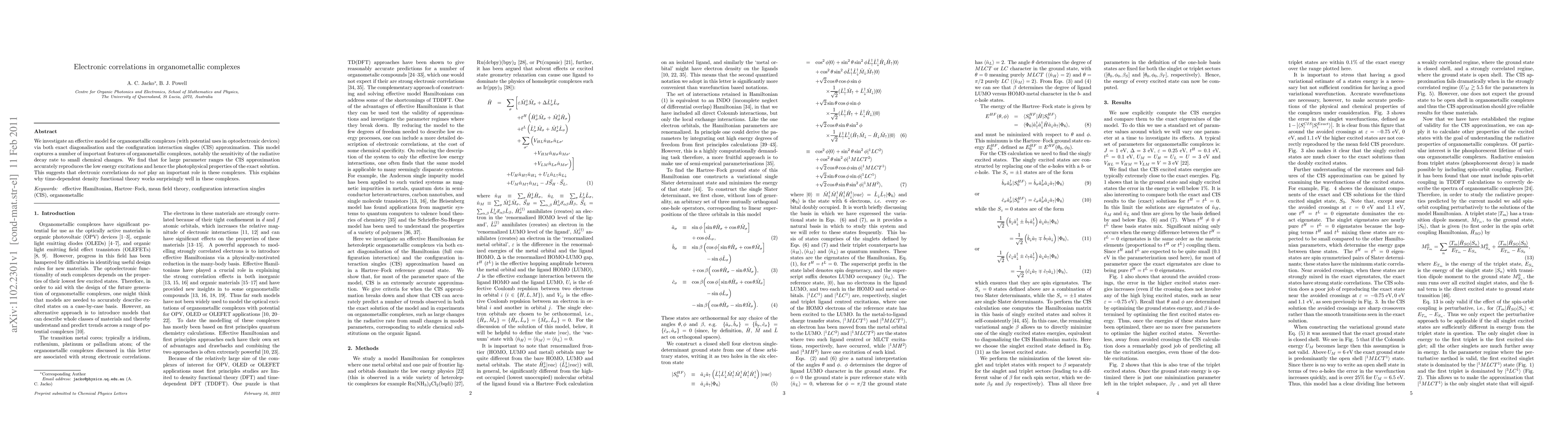 We investigate an effective model for organometallic complexes (with potential uses in optoelectronic devices) via both exact diagonalisation and the configuration interaction singles (CIS) approximation. This model captures a number of important features of organometallic complexes, notably the sensitivity of the radiative decay rate to small chemical changes. We find that for large parameter ranges the CIS approximation accurately reproduces the low energy excitations and hence the photophysical properties of the exact solution. This suggests that electronic correlations do \emph{not} play an important role in these complexes. This explains why time-dependent density functional theory works surprisingly well in these complexes.