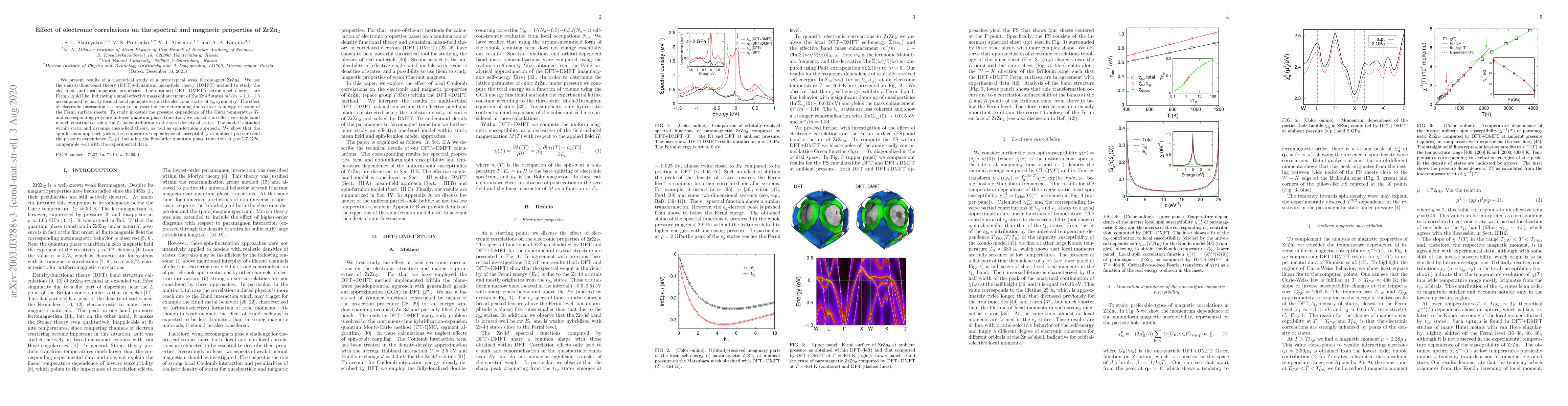 We present results of a theoretical study of a prototypical weak ferromagnet ZrZn$_2$. We use the density-functional theory (DFT)+dynamical mean-field theory (DMFT) method to study the electronic and local magnetic properties. The obtained DFT+DMFT electronic self-energies are Fermi-liquid like, indicating a small effective mass enhancement of the Zr $4d$ states $m^*/m\sim 1.1 - 1.3$ accompanied by partly formed local moments within the electronic states of $t_{2g}$ symmetry. The effect of electronic interaction is shown to be essential for determining the correct topology of some of the Fermi surface sheets. To study in detail the pressure dependence of the Curie temperature $T_{\rm C}$ and corresponding pressure-induced quantum phase transition, we consider an effective single-band model, constructed using the Zr $4d$ contribution to the total density of states. The model is studied within static and dynamic mean-field theory, as well as spin-fermion approach. We show that the spin-fermion approach yields the temperature dependence of susceptibility at ambient pressure and the pressure dependence $T_{\rm C}(p)$, including the first-order quantum phase transition at $p\approx 1.7$~GPa, comparable well with the experimental data.