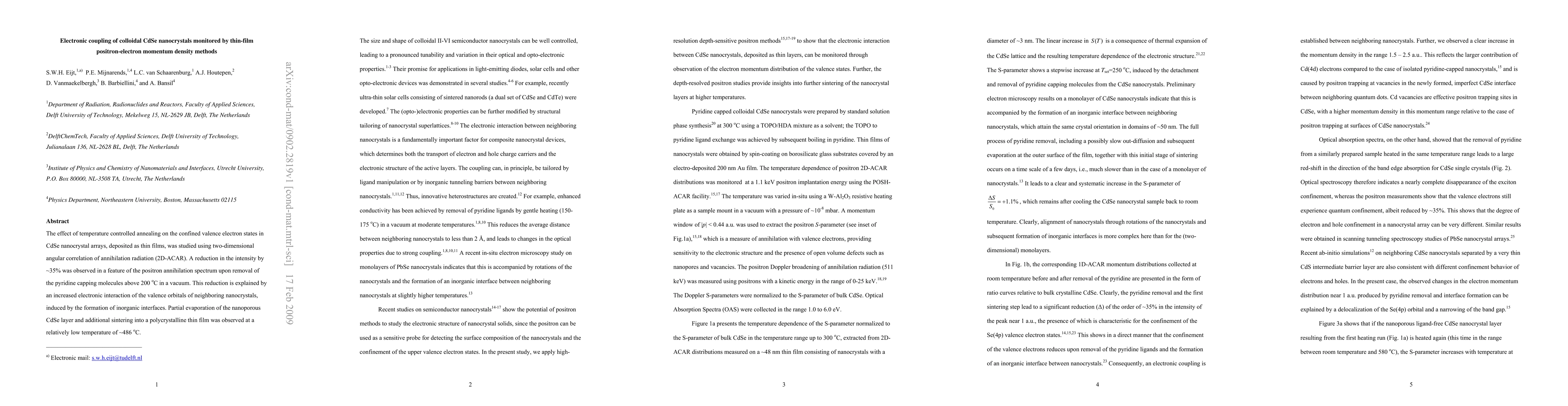 The effect of temperature controlled annealing on the confined valence electron states in CdSe nanocrystal arrays, deposited as thin films, was studied using two-dimensional angular correlation of annihilation radiation (2D-ACAR). A reduction in the intensity by ~35% was observed in a feature of the positron annihilation spectrum upon removal of the pyridine capping molecules above 200 degrees Celsius in a vacuum. This reduction is explained by an increased electronic interaction of the valence orbitals of neighboring nanocrystals, induced by the formation of inorganic interfaces. Partial evaporation of the nanoporous CdSe layer and additional sintering into a polycrystalline thin film was observed at a relatively low temperature of ~486 degrees Celsius.
