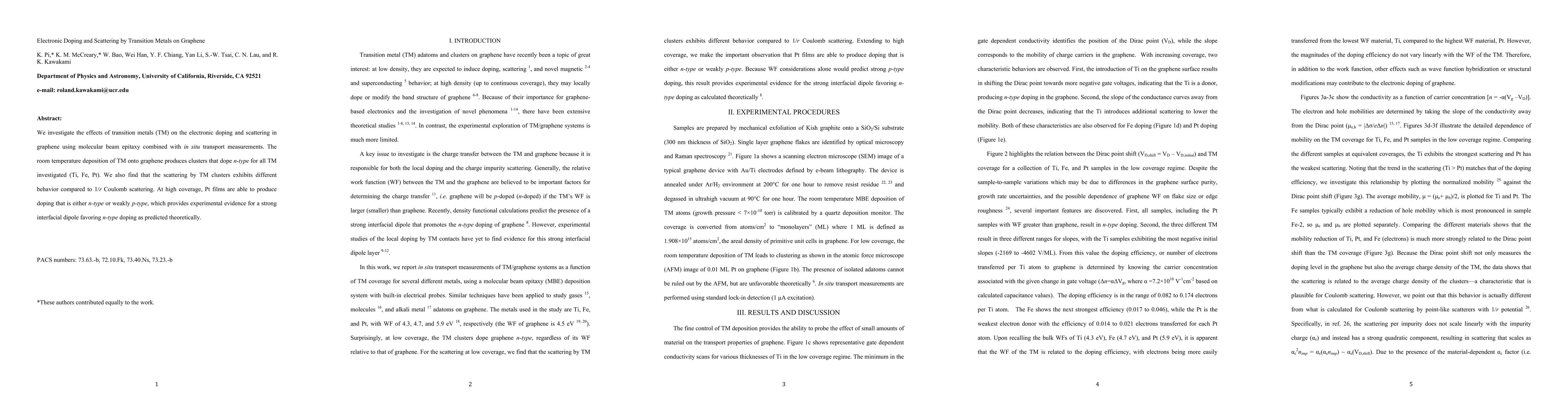 This study explores how transition metals (Ti, Fe, Pt) affect electronic doping and scattering in graphene, revealing n-type doping for all metals. It also highlights unique scattering behaviors and demonstrates that Pt films can induce either n-type or weakly p-type doping, supporting theoretical predictions of a strong interfacial dipole favoring n-type doping.
