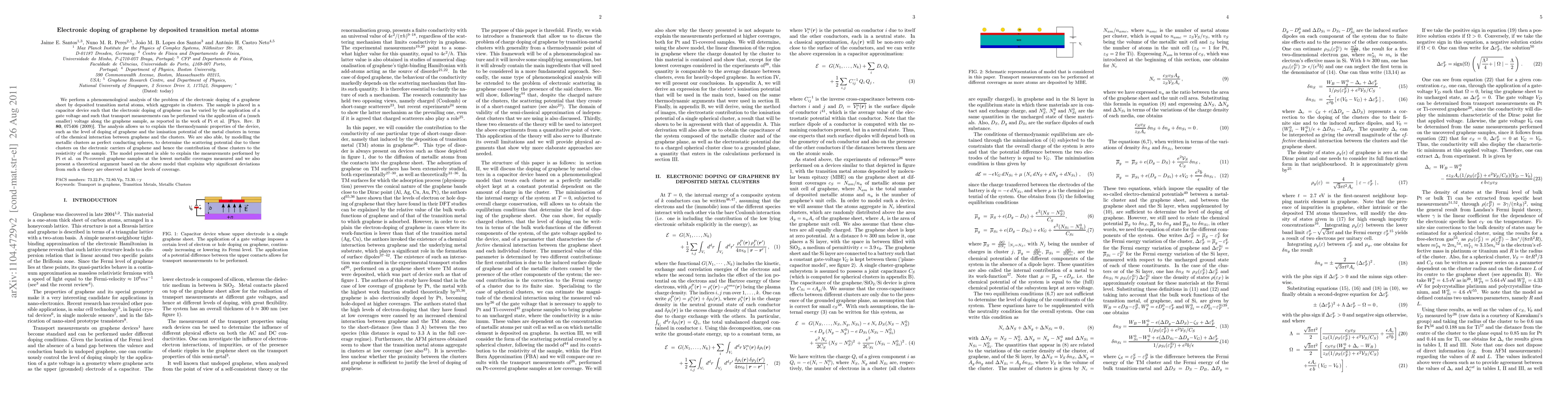 We perform a phenomenological analysis of the problem of the electronic doping of a graphene sheet by deposited transition metal atoms, which aggregate in clusters. The sample is placed in a capacitor device such that the electronic doping of graphene can be varied by the application of a gate voltage and such that transport measurements can be performed via the application of a (much smaller) voltage along the graphene sample, as reported in the work of Pi et al. [Phys. Rev. B 80, 075406 (2009)]. The analysis allows us to explain the thermodynamic properties of the device, such as the level of doping of graphene and the ionisation potential of the metal clusters in terms of the chemical interaction between graphene and the clusters. We are also able, by modelling the metallic clusters as perfect conducting spheres, to determine the scattering potential due to these clusters on the electronic carriers of graphene and hence the contribution of these clusters to the resistivity of the sample. The model presented is able to explain the measurements performed by Pi et al. on Pt-covered graphene samples at the lowest metallic coverages measured and we also present a theoretical argument based on the above model that explains why significant deviations from such a theory are observed at higher levels of coverage.
