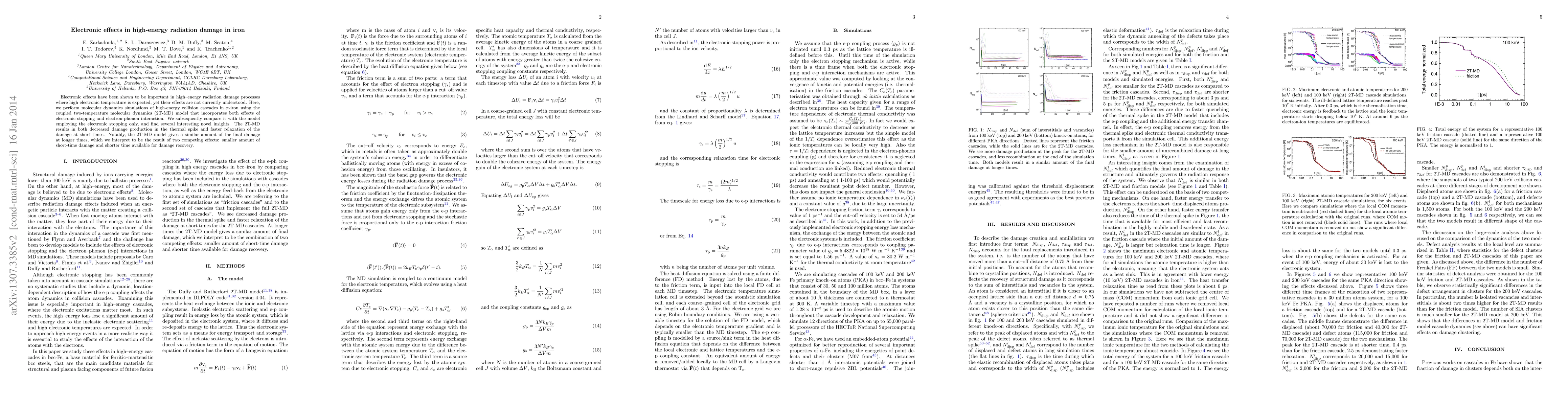 This study uses molecular dynamics simulations to explore electronic effects in high-energy radiation damage in iron, revealing that the coupled two-temperature model reduces short-term damage and accelerates damage relaxation, though it results in similar long-term damage due to competing effects.