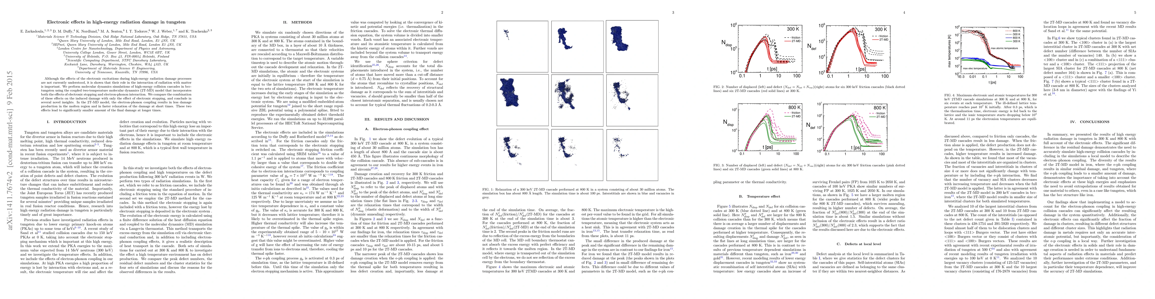 This study investigates the role of electronic excitations in high-energy radiation damage in bcc-tungsten using molecular dynamics simulations. The coupled two-temperature model reveals that electron-phonon coupling reduces damage in the molten region and accelerates damage relaxation, leading to less overall damage over time.