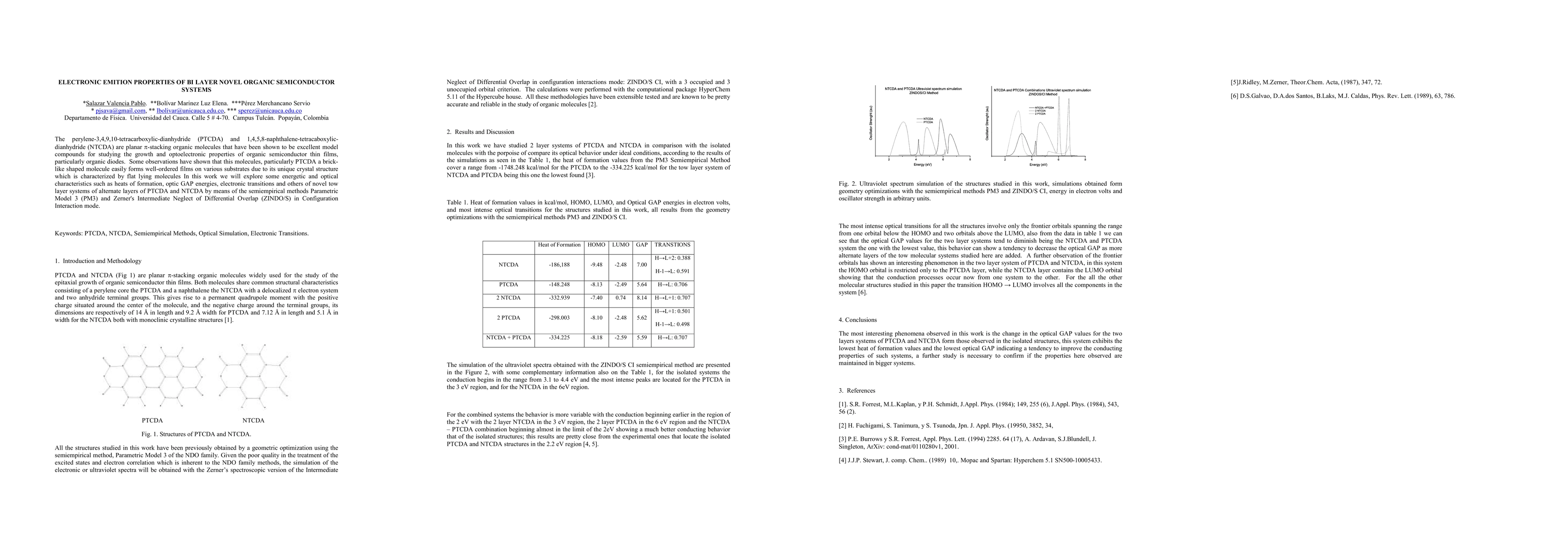 The perylene-3,4,9,10-tetracarboxylic-dianhydride (PTCDA) and 1,4,5,8-naphthalene-tetracaboxylic-dianhydride (NTCDA) are planar pi-stacking organic molecules that have been shown to be excellent model compounds for studying the growth and optoelectronic properties of organic semiconductor thin films, particularly organic diodes. Some observations have shown that this molecules, particularly PTCDA a brick-like shaped molecule easily forms well-ordered films on various substrates due to its unique crystal structure which is characterized by flat lying molecules In this work we will explore some energetic and optical characteristics such as heats of formation, optic GAP energies, electronic transitions and others of novel tow layer systems of alternate layers of PTCDA and NTCDA by means of the semiempirical methods Parametric Model 3 (PM3) and Zerner's Intermediate Neglect of Differential Overlap (ZINDO/S) in Configuration Interaction mode.