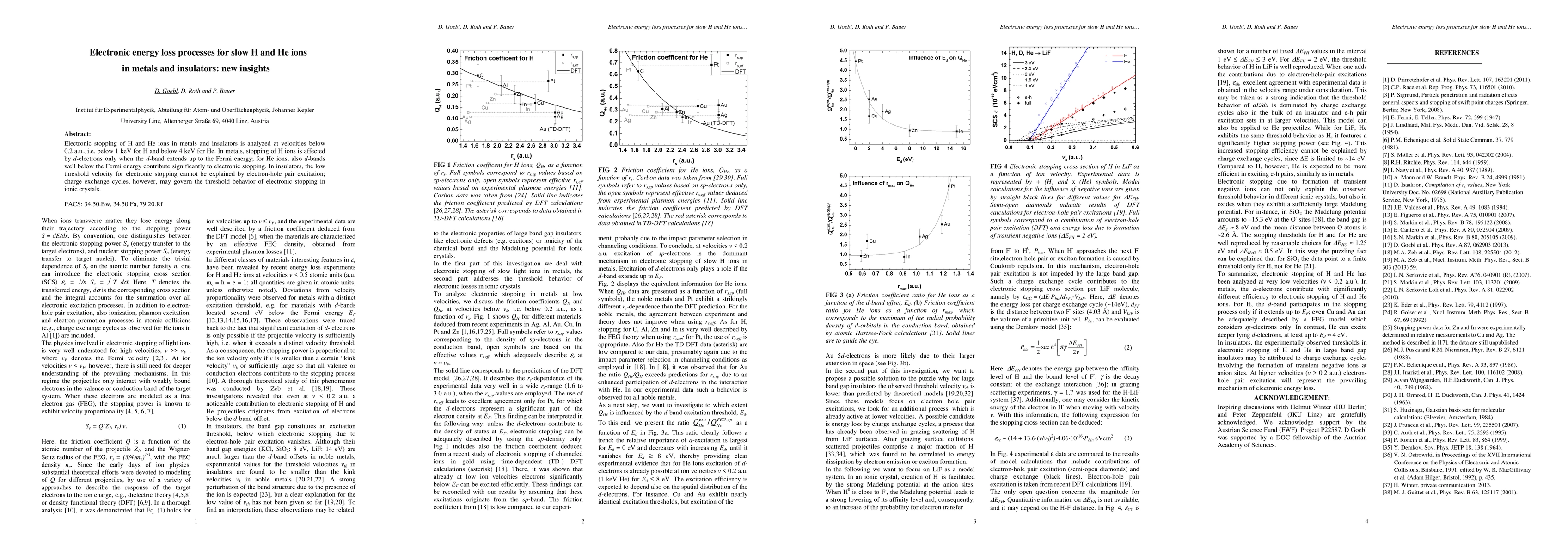 This paper investigates electronic energy loss processes for slow H and He ions in metals and insulators, finding that d-electrons in metals significantly affect H ion stopping when the d-band reaches the Fermi energy, while He ion stopping is influenced by d-bands below the Fermi energy. In insulators, electron-hole pair excitation does not explain the low threshold velocity for electronic stopping, suggesting charge exchange cycles may be the primary factor.