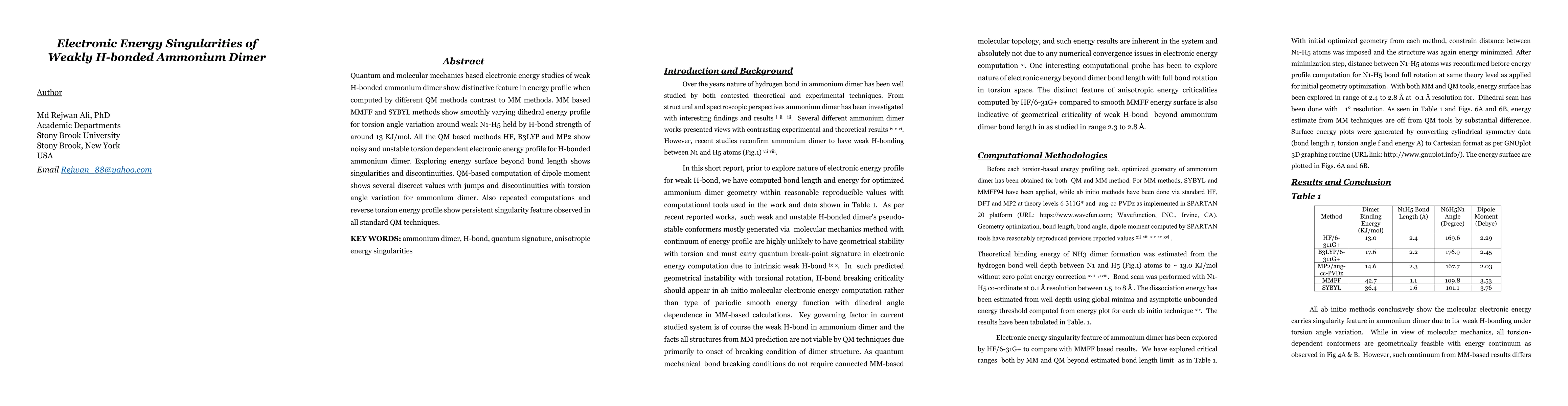 The paper presents a comprehensive analysis of electronic energy singularities in weakly H-bonded ammonium dimer using various QM and MM methods, revealing discreet energy levels and torsion-dependent dipole moment features.