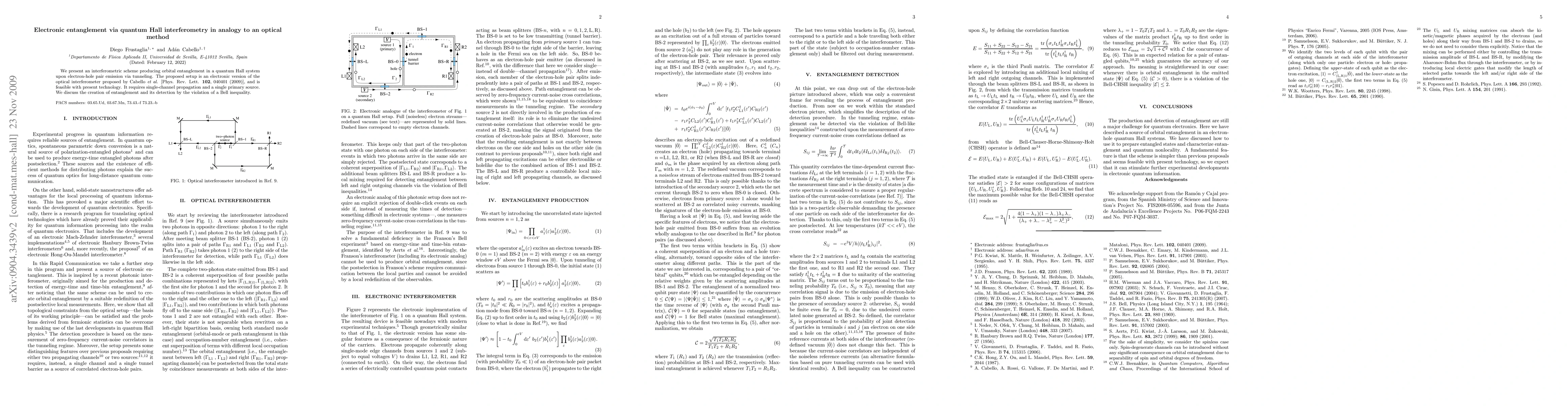 We present an interferometric scheme producing orbital entanglement in a quantum Hall system upon electron-hole pair emission via tunneling. The proposed setup is an electronic version of the optical interferometer proposed by Cabello et al. [Phys. Rev. Lett. 102, 040401 (2009)], and is feasible with present technology. It requires single-channel propagation and a single primary source. We discuss the creation of entanglement and its detection by the violation of a Bell inequality.