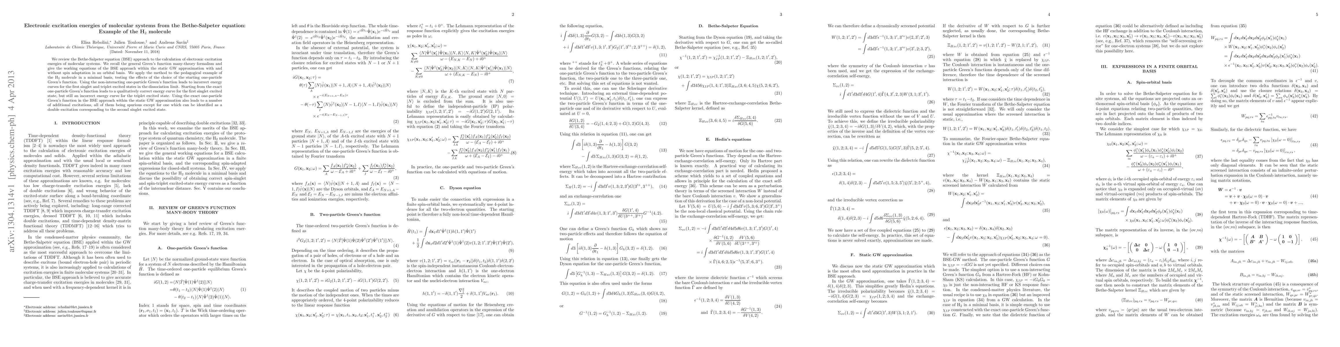 This paper reviews the Bethe-Salpeter equation (BSE) for calculating electronic excitation energies, applying it to the H2 molecule. It finds that using the exact one-particle Green's function within the static GW approximation provides a qualitatively correct first singlet excited state but still fails for the triplet state, highlighting the method's limitations.
