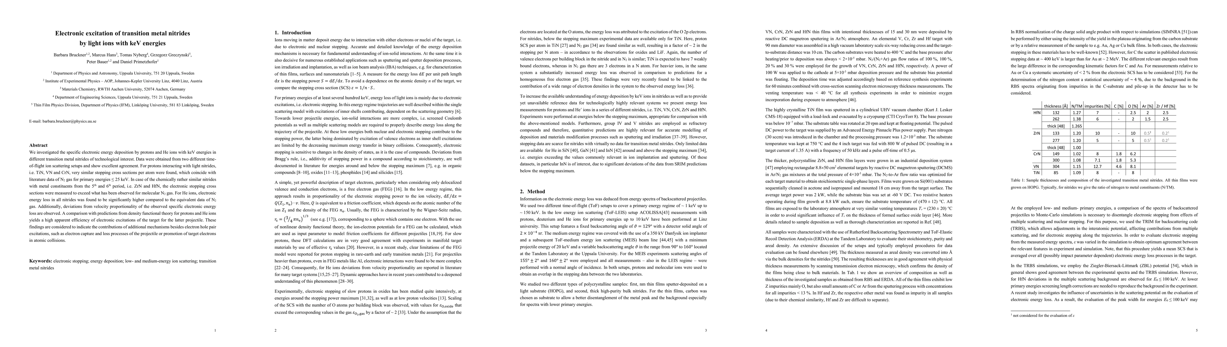 This study investigates electronic energy deposition by keV protons and He ions in various transition metal nitrides, revealing higher electronic stopping cross sections for ZrN and HfN compared to N2 gas, and significant deviations in electronic energy loss for He ions. The findings suggest additional mechanisms beyond electron hole pair excitations in the electronic excitation process.