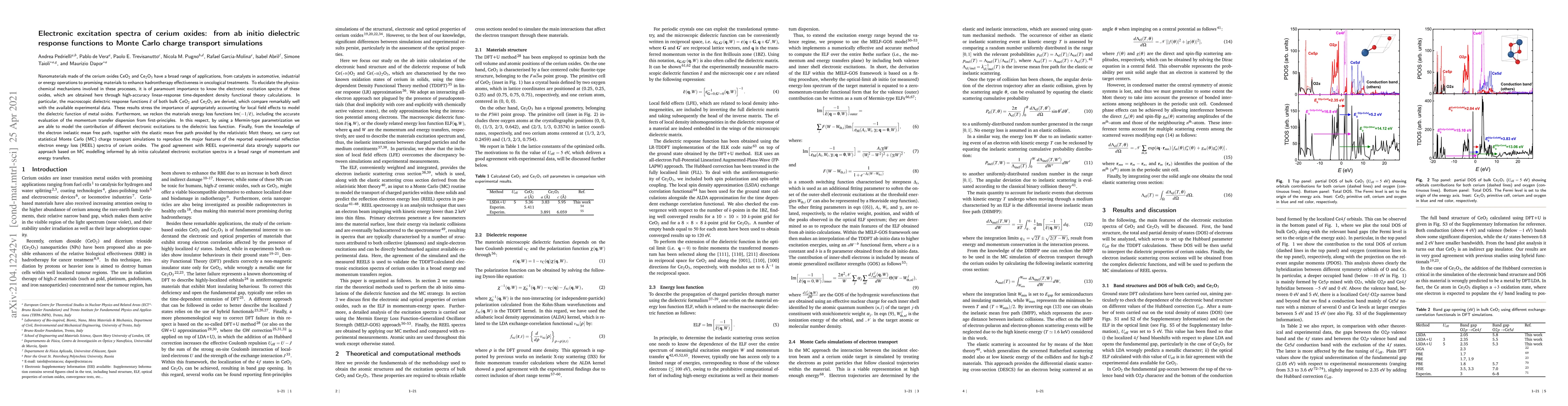 Nanomaterials made of the cerium oxides CeO$_2$ and Ce$_2$O$_3$ have a broad range of applications, from catalysts in automotive, industrial or energy operations to promising materials to enhance hadrontherapy effectiveness in oncological treatments. To elucidate the physico-chemical mechanisms involved in these processes, it is of paramount importance to know the electronic excitation spectra of these oxides, which are obtained here through high-accuracy linear-response time-dependent density functional theory calculations. In particular, the macroscopic dielectric response functions $\bar\epsilon$ of both bulk CeO$_2$ and Ce$_2$O$_3$ are derived, which compare remarkably well with the available experimental data. These results stress the importance of appropriately accounting for local field effects to model the dielectric function of metal oxides. Furthermore, we reckon the materials energy loss functions $\mbox{Im} (-1/\bar{\epsilon})$, including the accurate evaluation of the momentum transfer dispersion from first-principles. In this respect, by using a Mermin-type parametrization we are able to model the contribution of different electronic excitations to the dielectric loss function. Finally, from the knowledge of the electron inelastic mean free path, together with the elastic mean free path provided by the relativistic Mott theory, we carry out statistical Monte Carlo (MC) charge transport simulations to reproduce the major features of the reported experimental reflection electron energy loss (REEL) spectra of cerium oxides. The good agreement with REEL experimental data strongly supports our approach based on MC modelling informed by ab initio calculated electronic excitation spectra in a broad range of momentum and energy transfers.